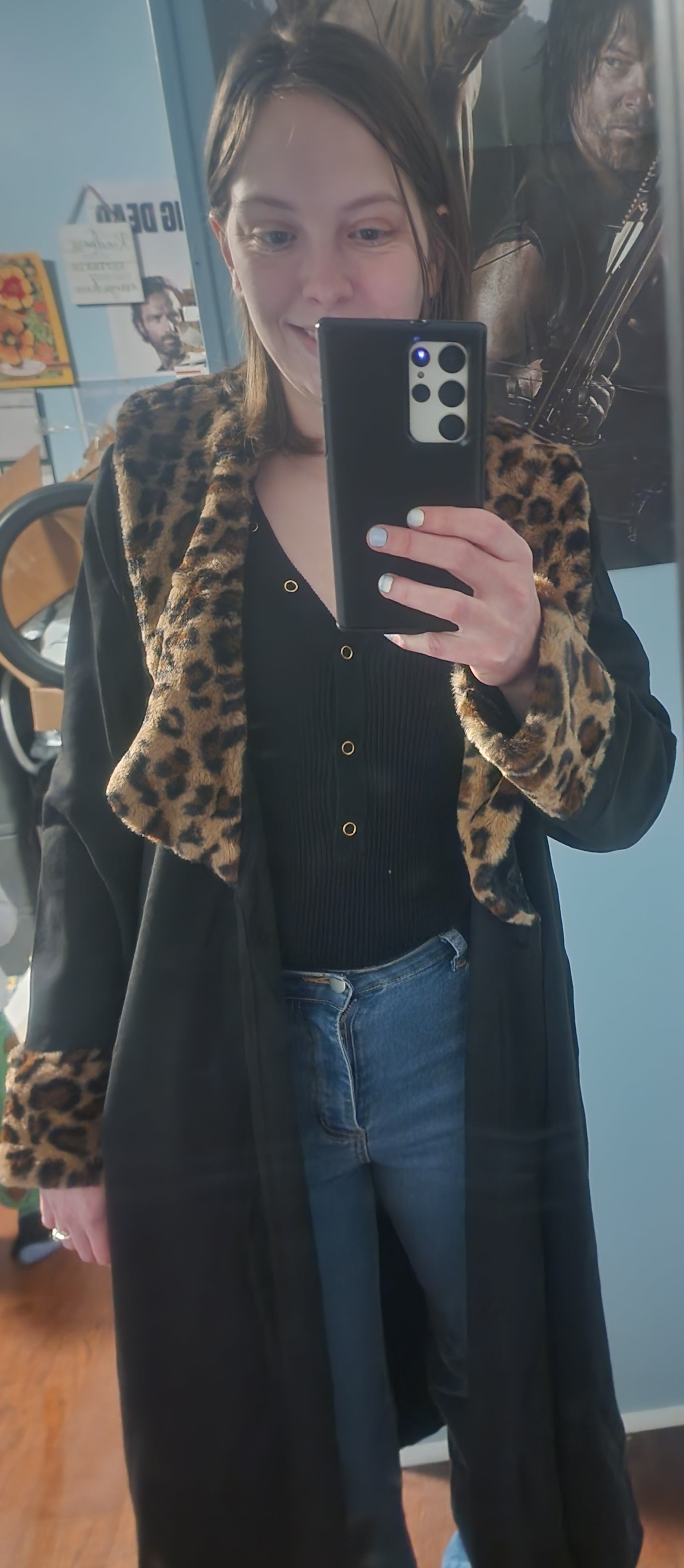 This duster is so pretty and elegant. It is black with cheetah print fur on the neck and wrists. It's lined inside so it's warm and so soft. It has a one button closure with Buffalo nickel detailing. 55% cotton, 35%polyester, 10% wool. Machine wash cold.