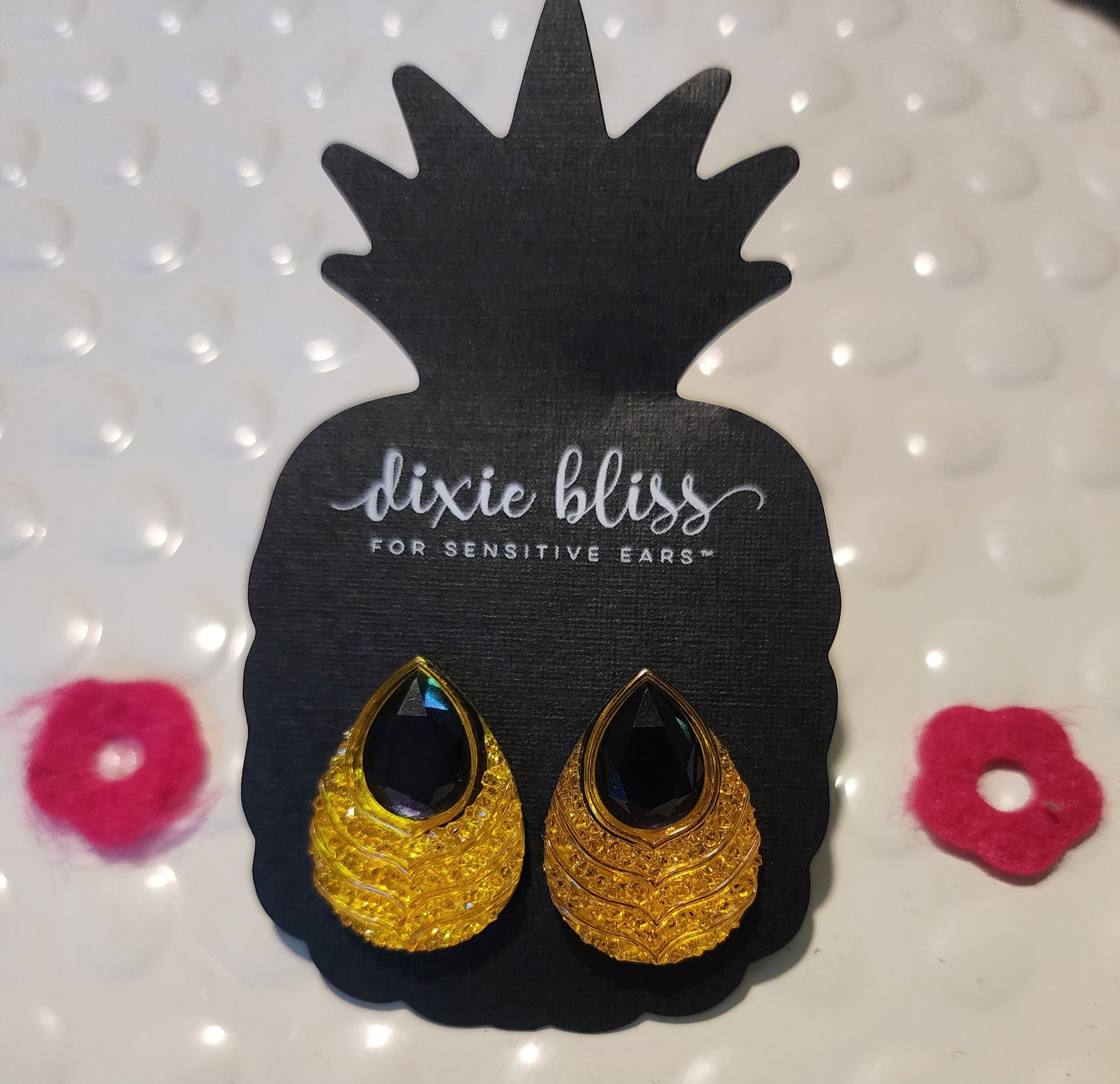 These earrings are gold and green teardrops with lots of little faux jewels encrusted in this. They are studs. Approximately 1" x 1".