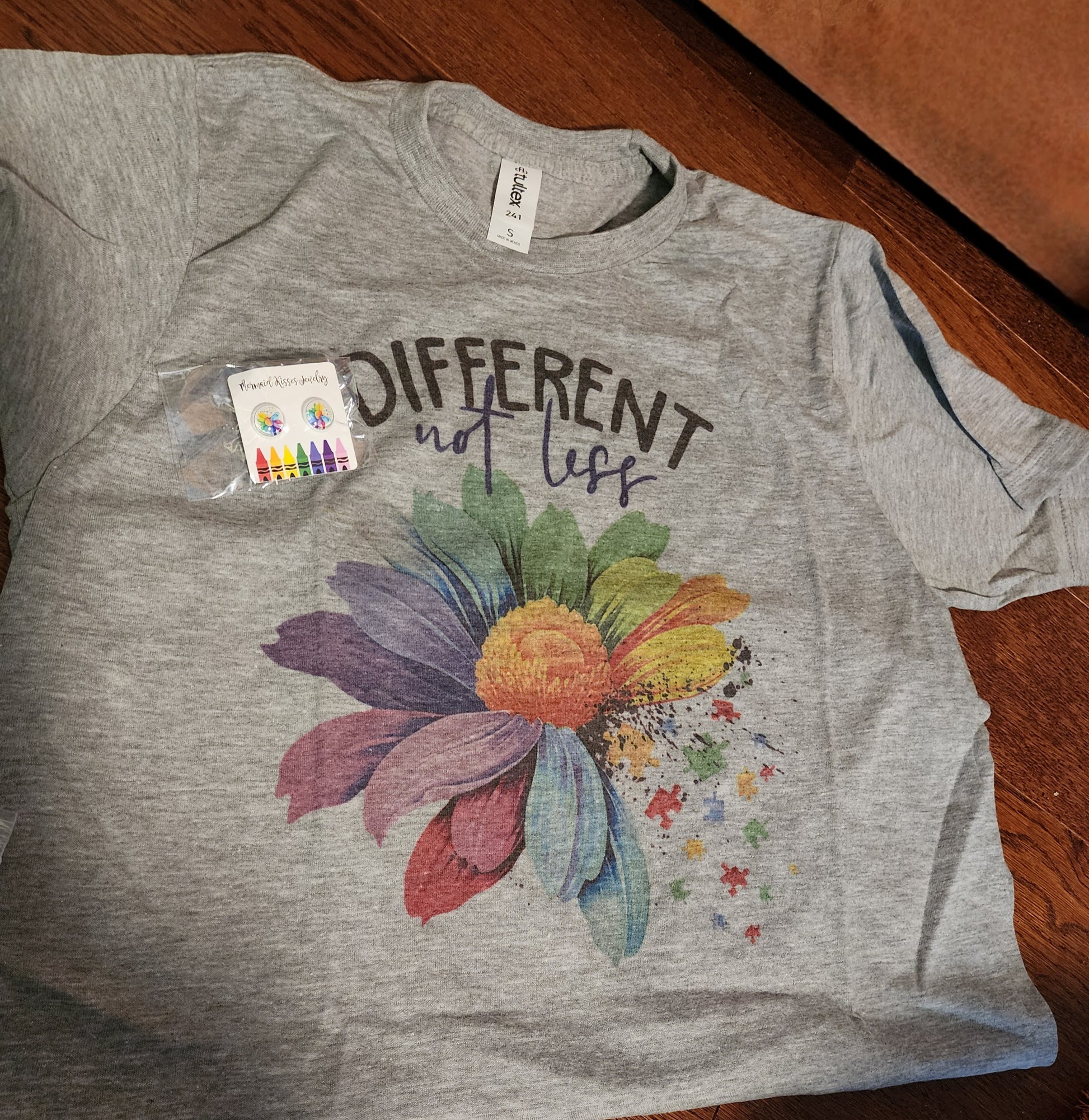 This ser has an autism T shirt that says "Different not Less" and a pair of matching earrings. It's pressed on Tultex.