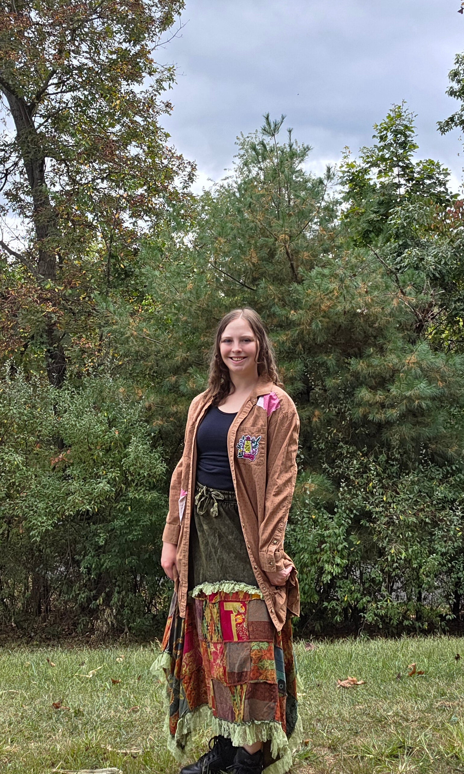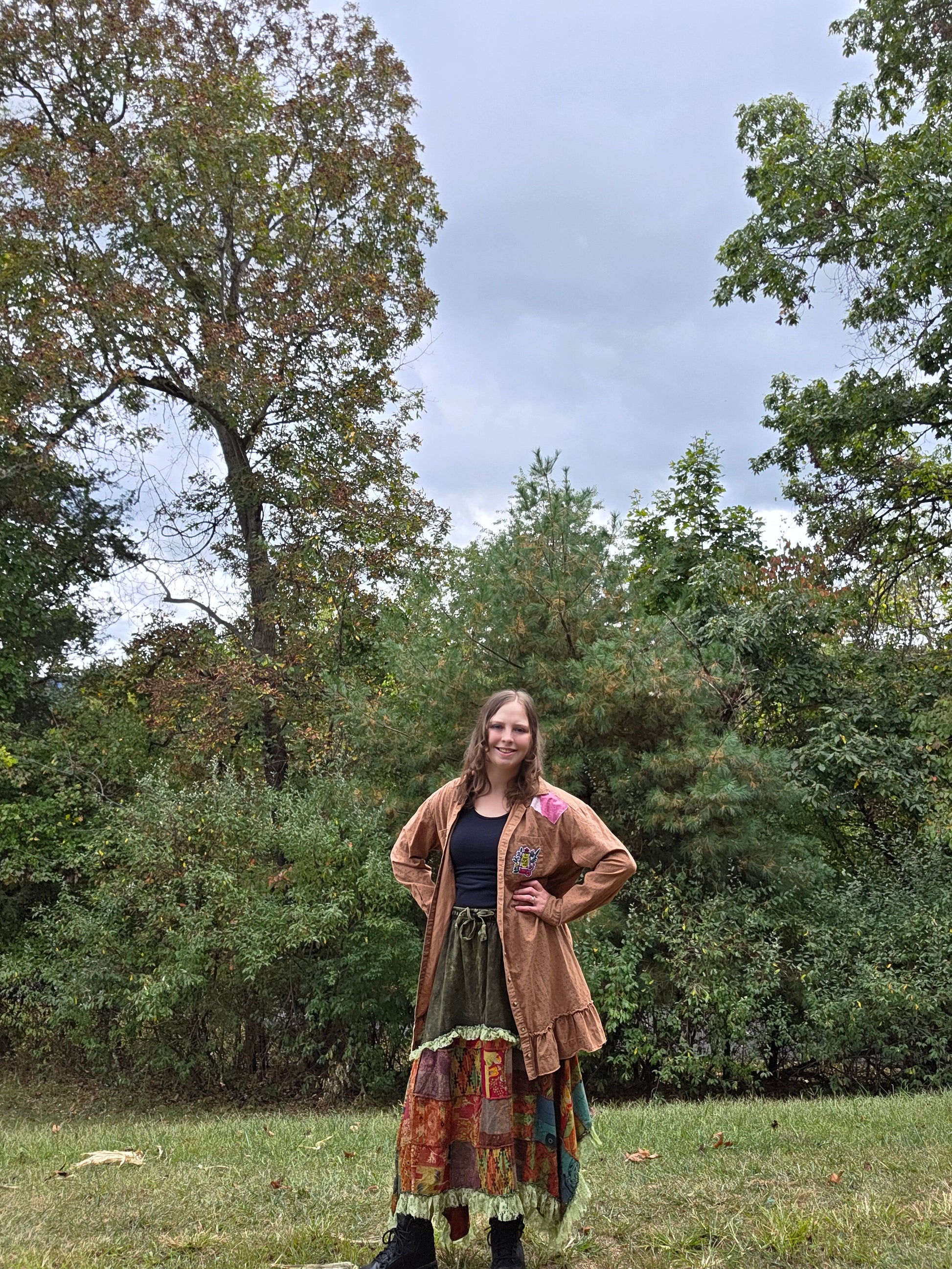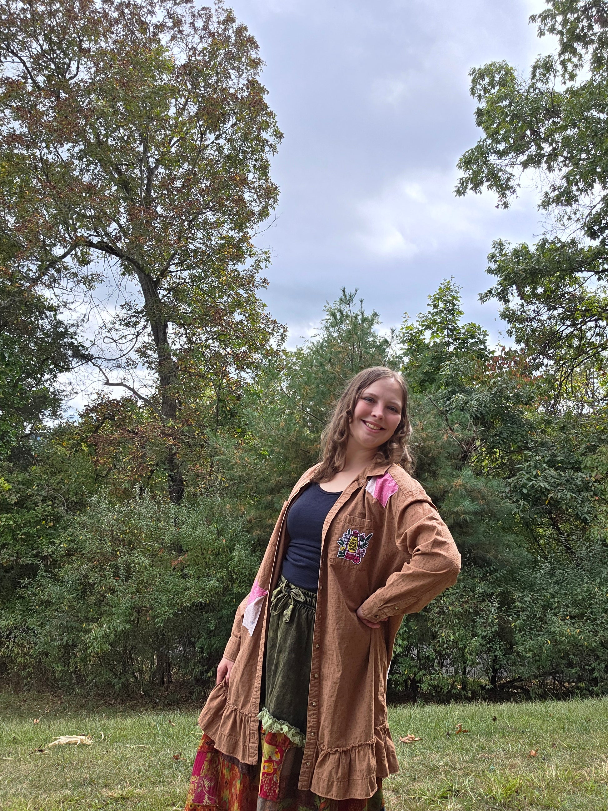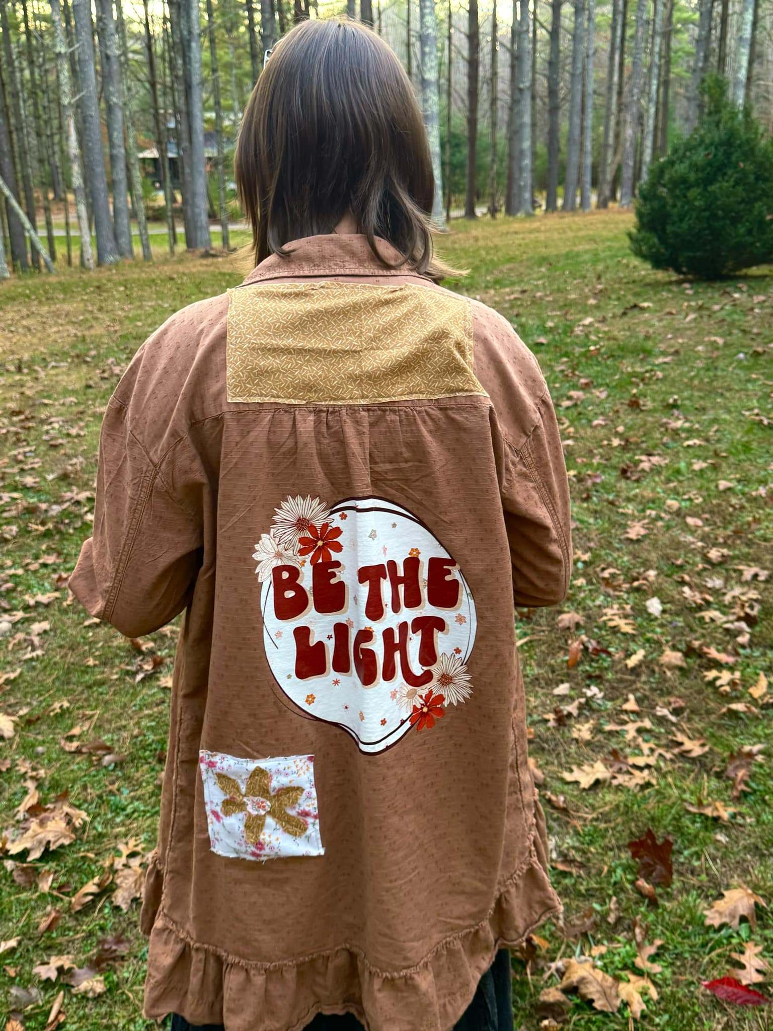 This shirt is beautiful. It's a long fit and had been personalized with patches, an iron on patch on the pocket, and a DTF print on the back. It's all reminders to be the light for all to see from the book of Matthew. So cute and cheery and one of a kind. Shirt brand is Wonderly.