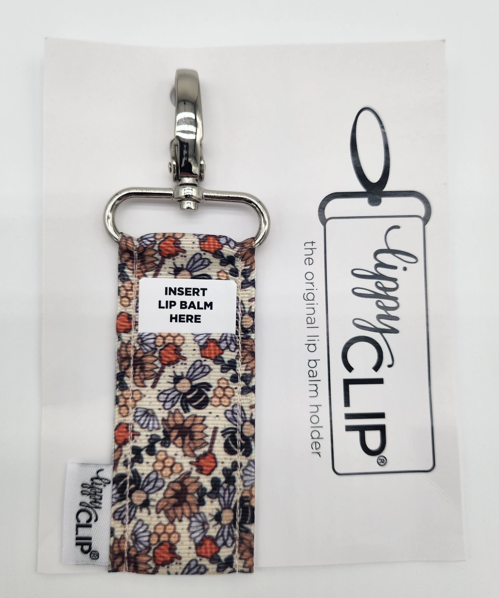 This LippyClip features a tab print with bees, honeycomb, and flowers.