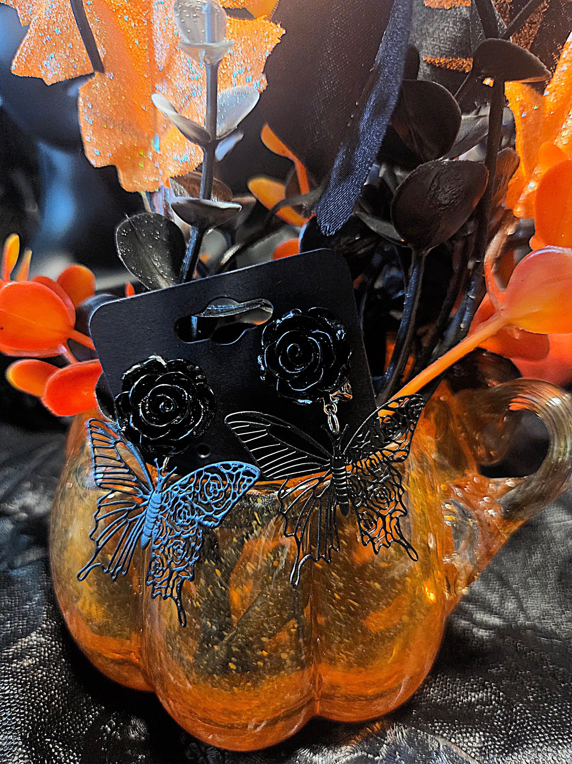 These clip on earrings are so cute with delicate black butterflies with beautiful details! The clip is a rose. They're made of a very thin lightweight metal. Approximately 2".