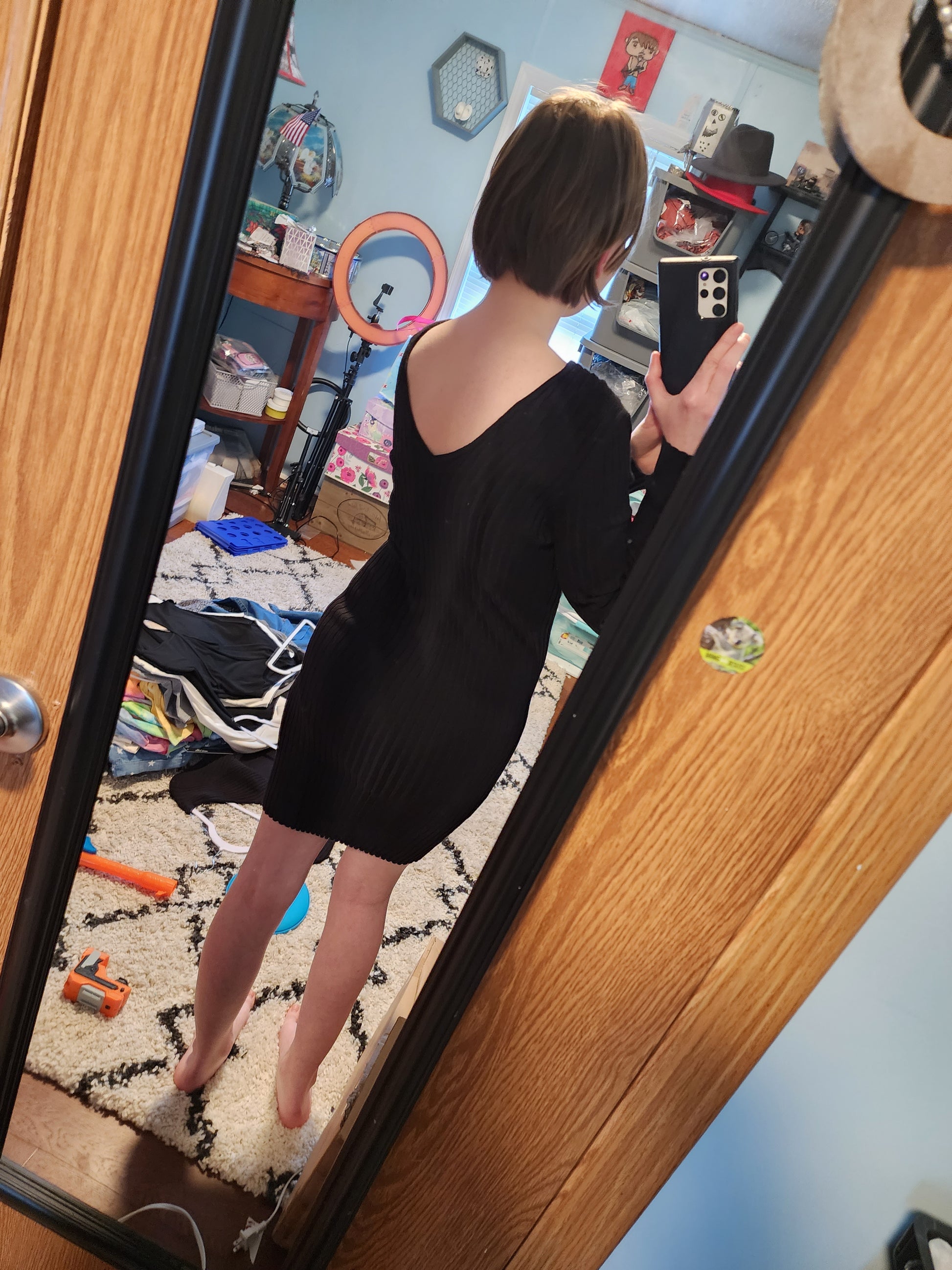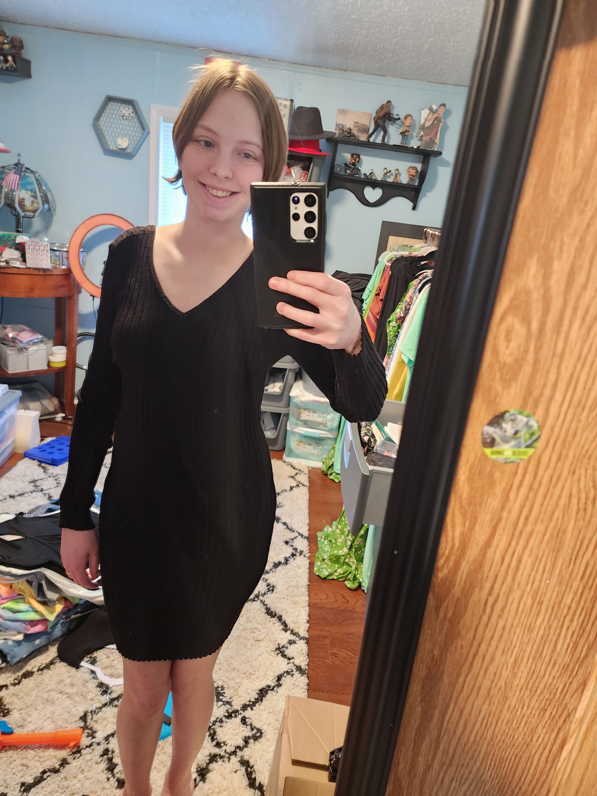 This dress is made of a thin sweater material. It is rib knit. It is long sleeve and goes down to your knee. Very cute and simple but can be dressed up as well.