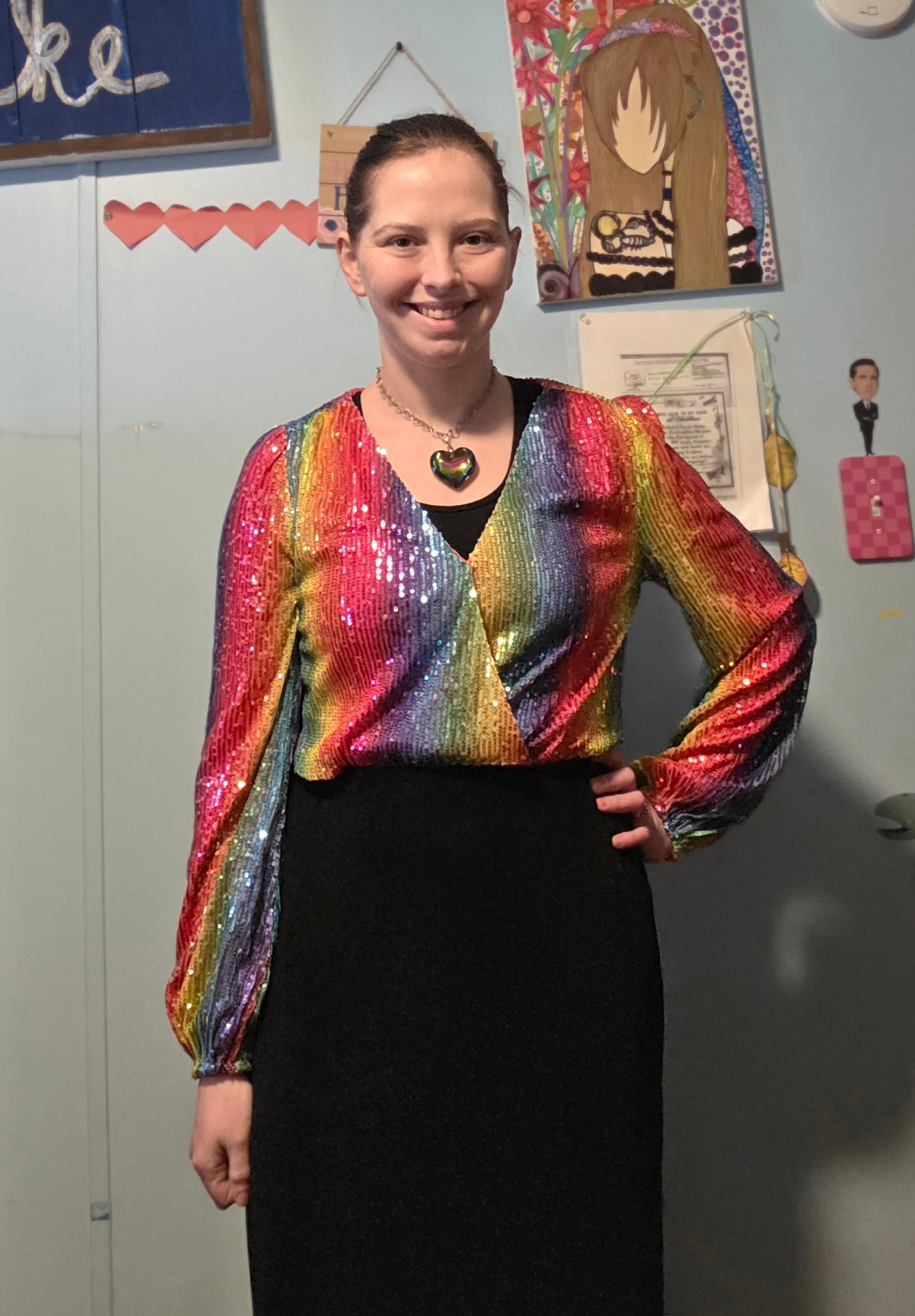 This beautiful piece is one of my absolute favorites. You'll be turning heads with this gorgeous romper because of the gorgeous colors and wonderful sequins. This is the absolute perfect piece for a concert, music festival, or even if you're just feeling a little extra. ♥️ it's got short bottoms, long sleeves with elastic in them, a button on the neckline, and it is lined inside.