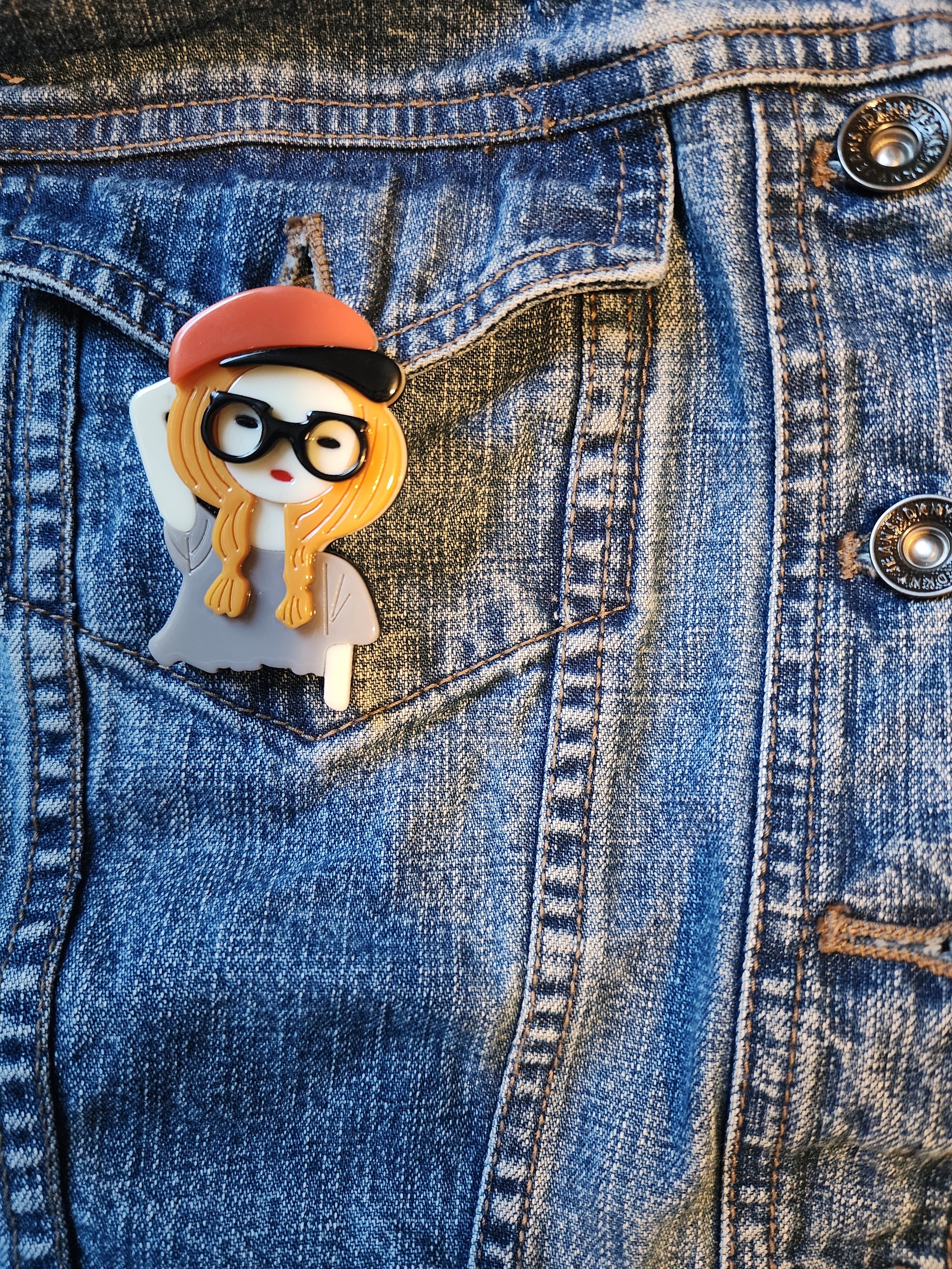 "Elizabeth" is such a fun pin with super fun pops of color and awesome 3D effects. She's unique and one of a kind and makes the perfect accessory for your purse to your jacket. Approximately 2 1/2" and has a clasp in the back to close it.