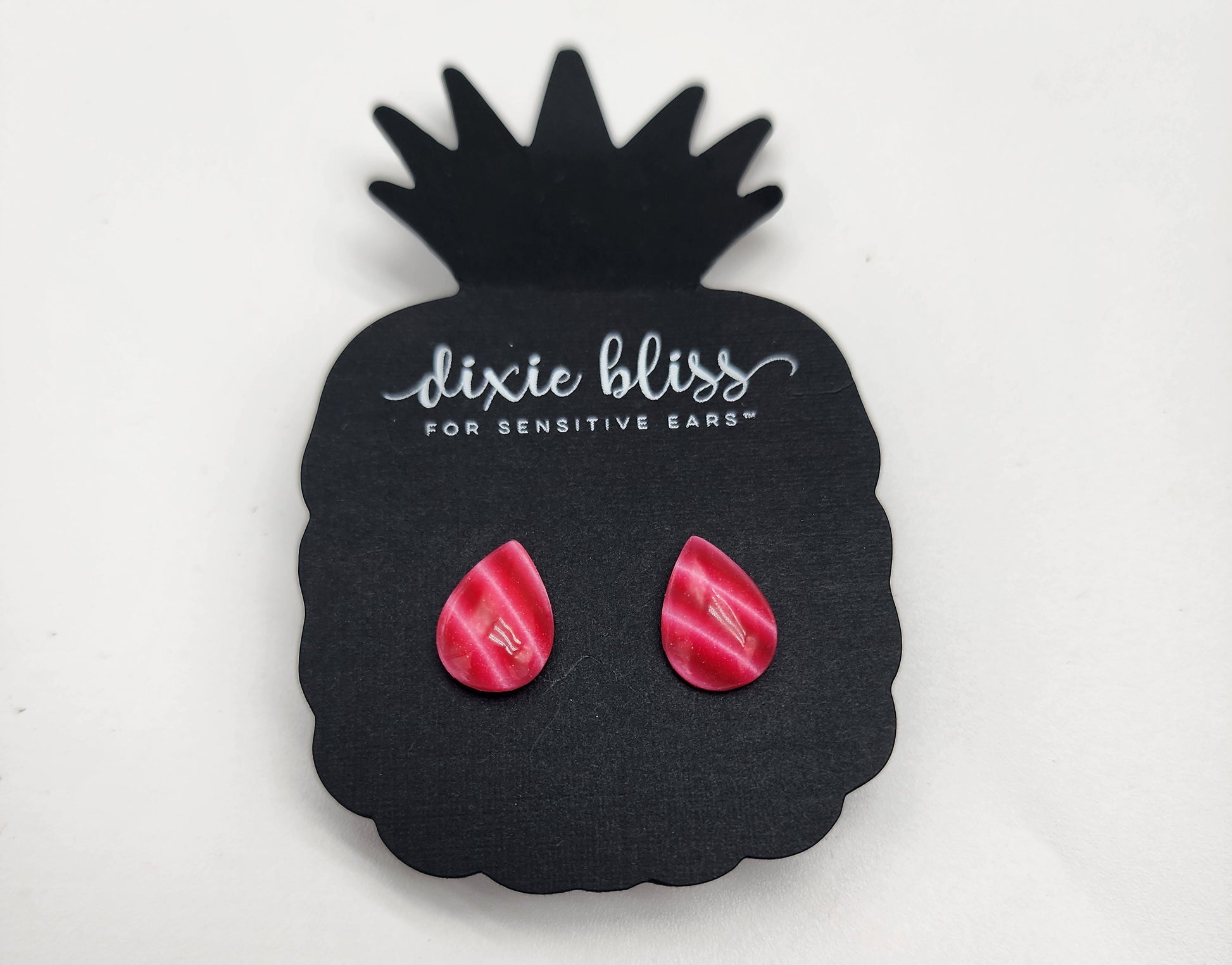 These earrings are small hot pink and red teardrops. They're approximately 1/2". They are studs.