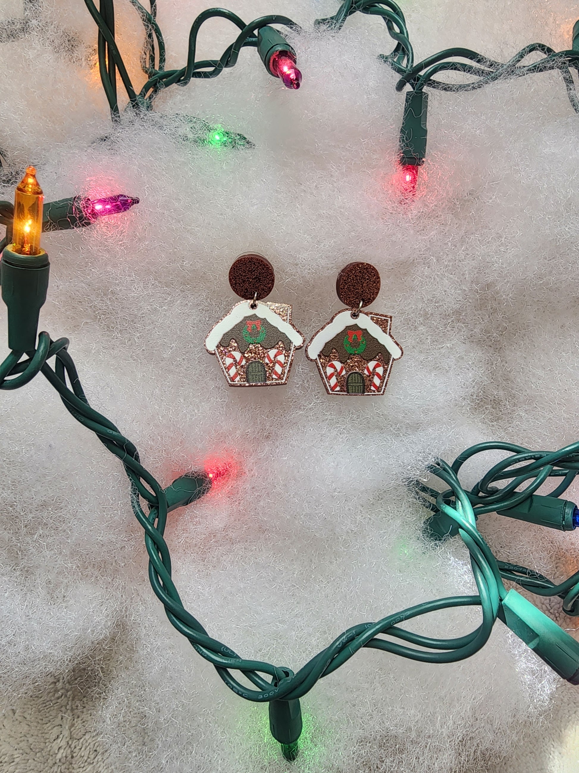 These earrings are the most precious gingerbread houses. They shine and glitter and have so much personality. They're acrylic, studded, and approximately 1 1/2".