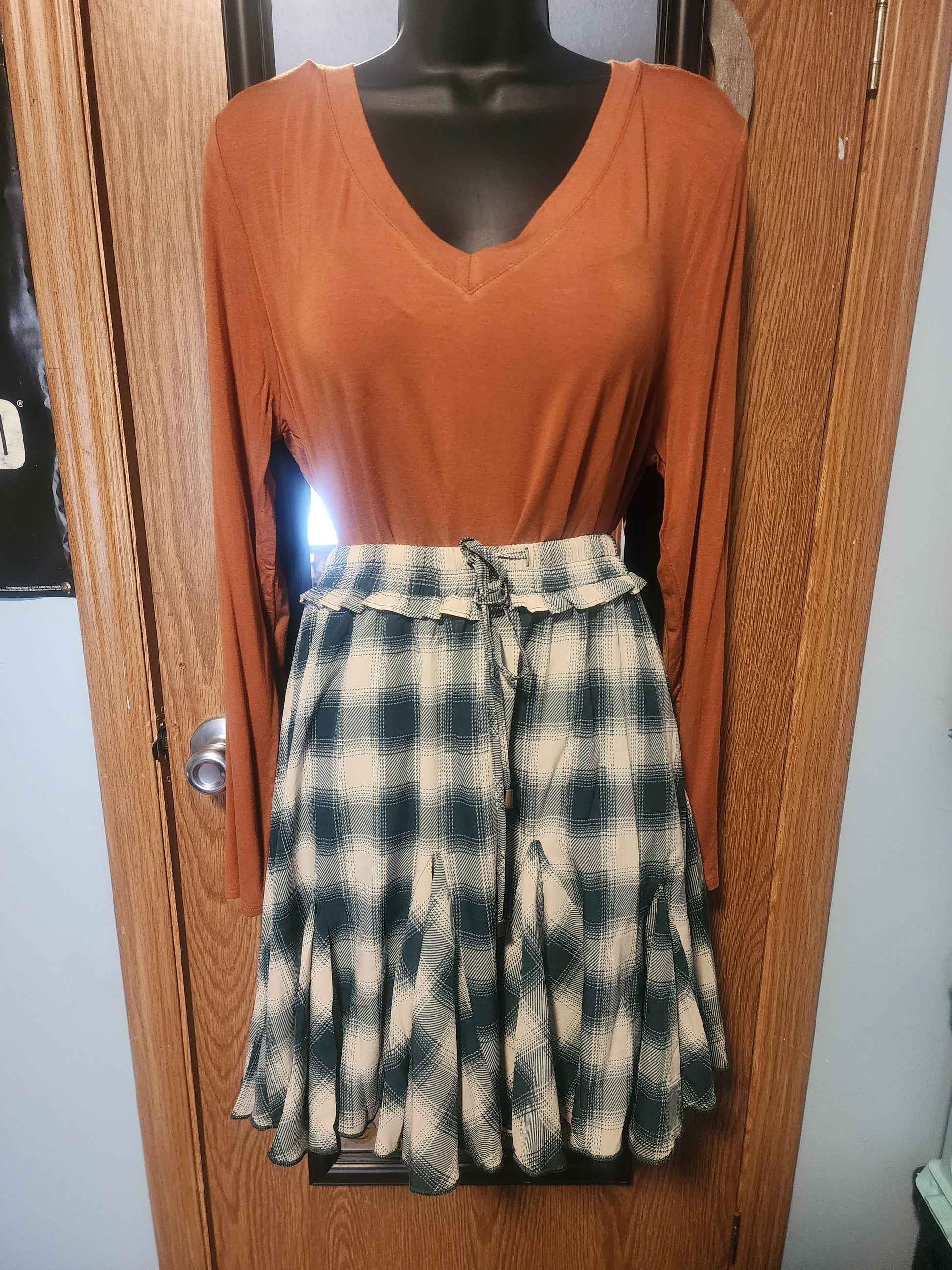 This skirt is so fun and bouncy. It has lining on the inside to keep you warm all year. It's a pretty green and cream color plaid. It has a tie to make it adjustable.