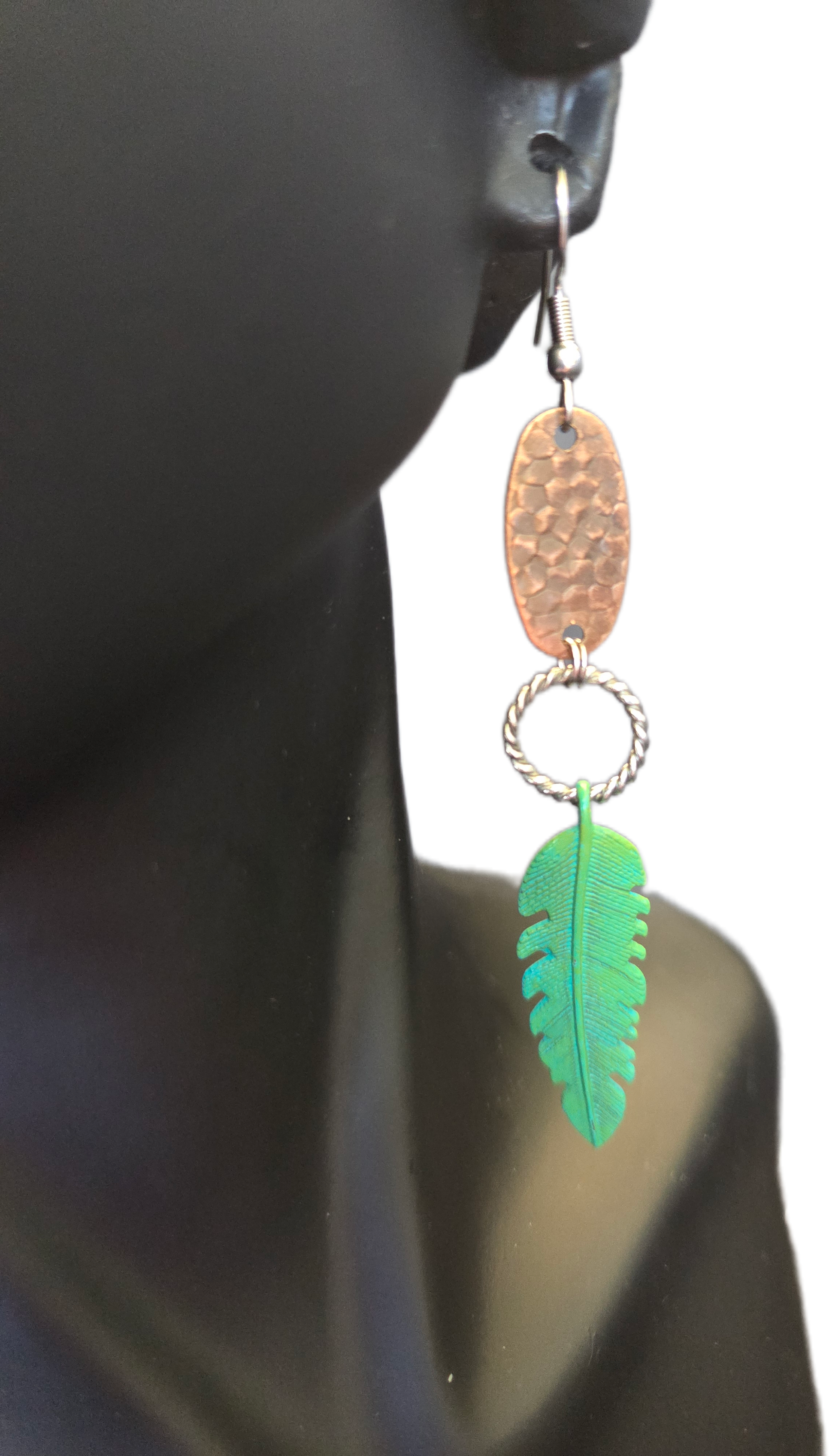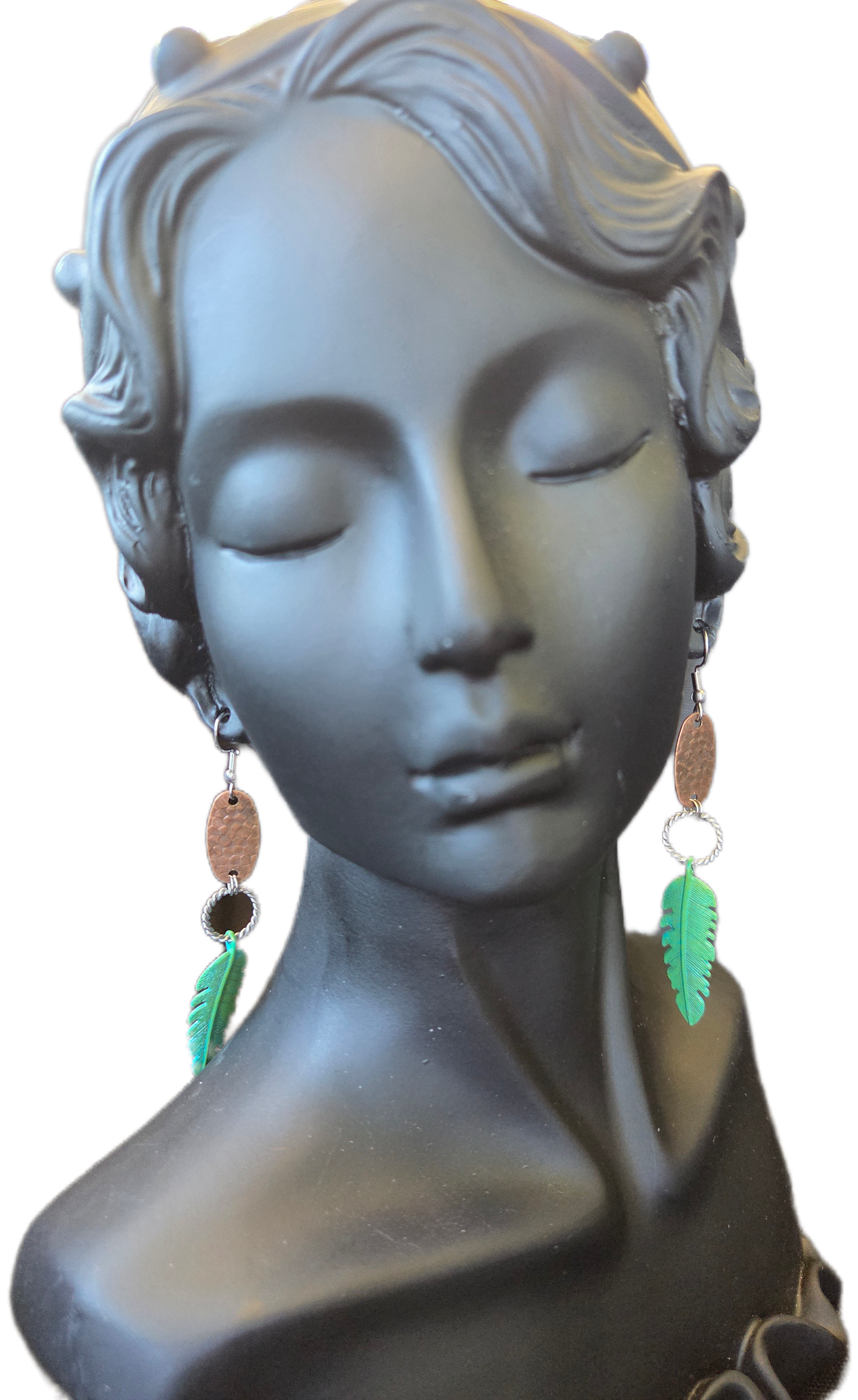 These beautiful earrings are handmade and done in a beautiful patina all by hand. They feature a brass hand hammered disc and a large brass feather at the bottom. They dangle and are approximately 3" long. So pretty and unique for the boho lover in all of us!