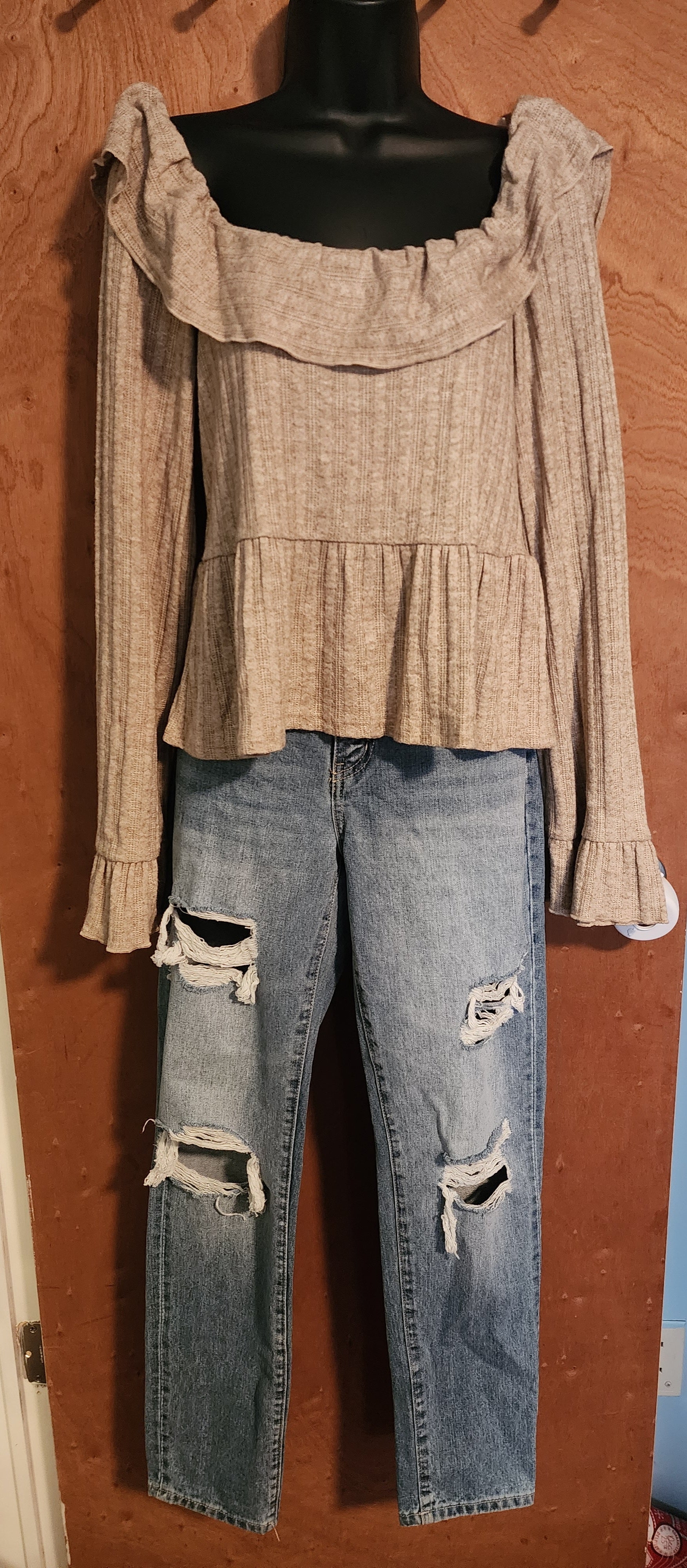 This off the shoulder top is a pretty tan brown color with ruffles on the neck and end of the sleeves. It's very soft.