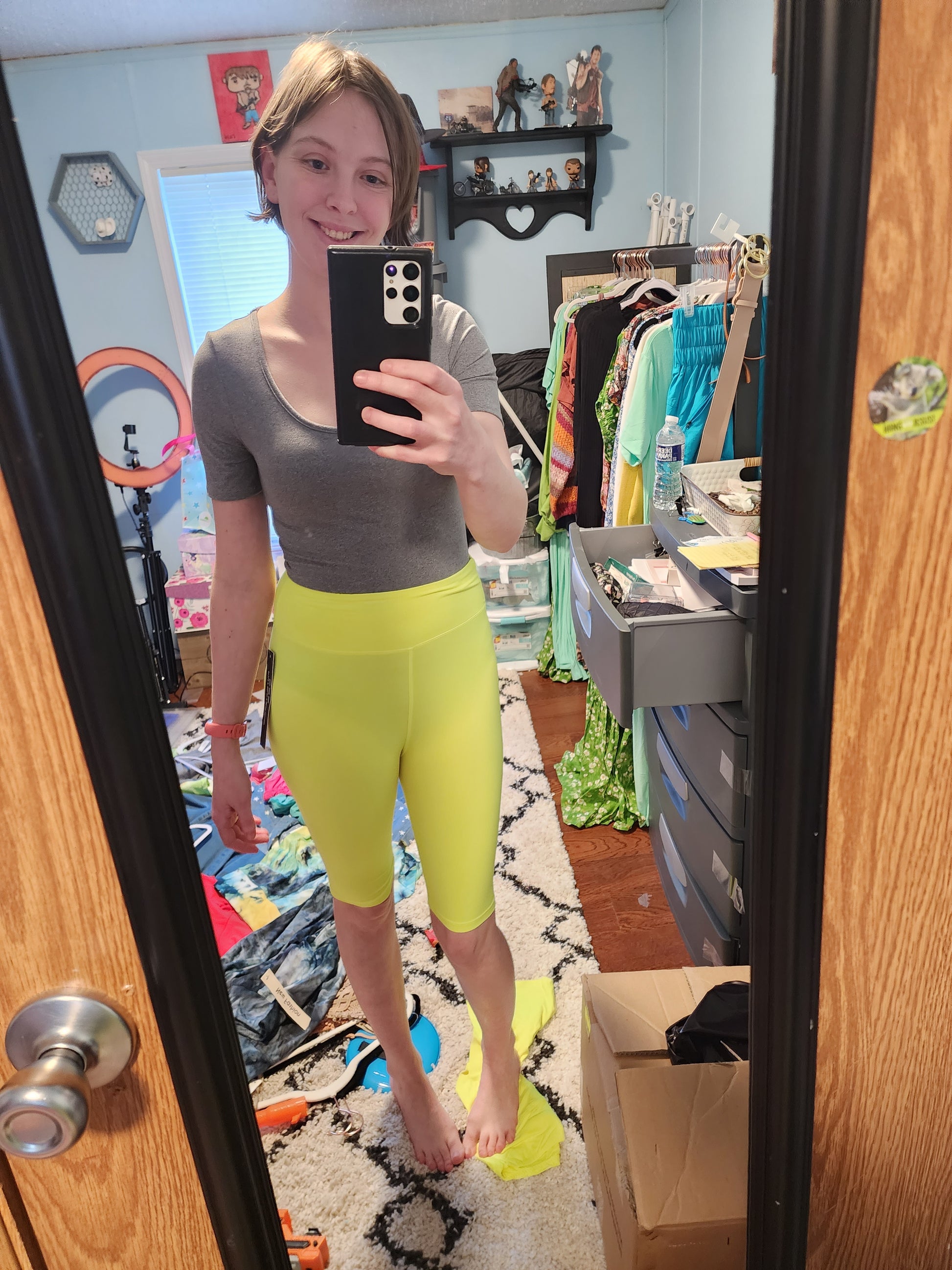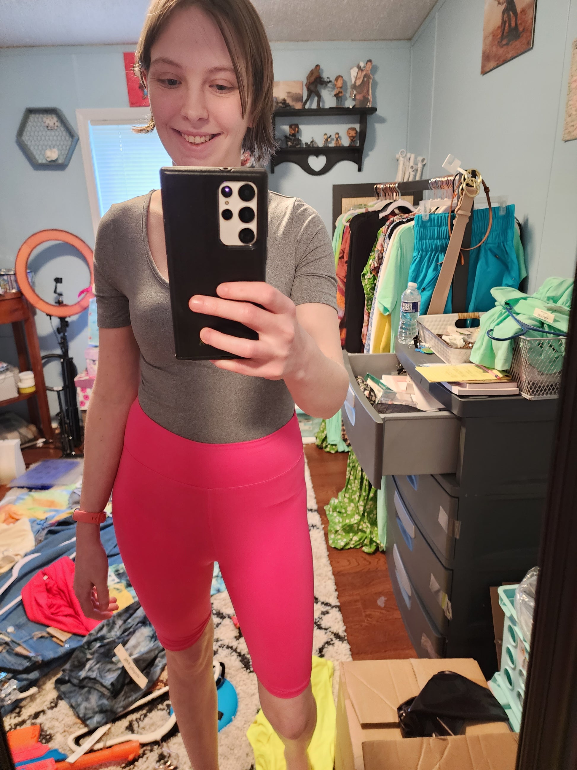These bike shorts are made of an excellent stretchy material. They easily fit size small to large. So comfy and cute! Great for wearing by themselves or layered under things to keep thighs from chaffing.