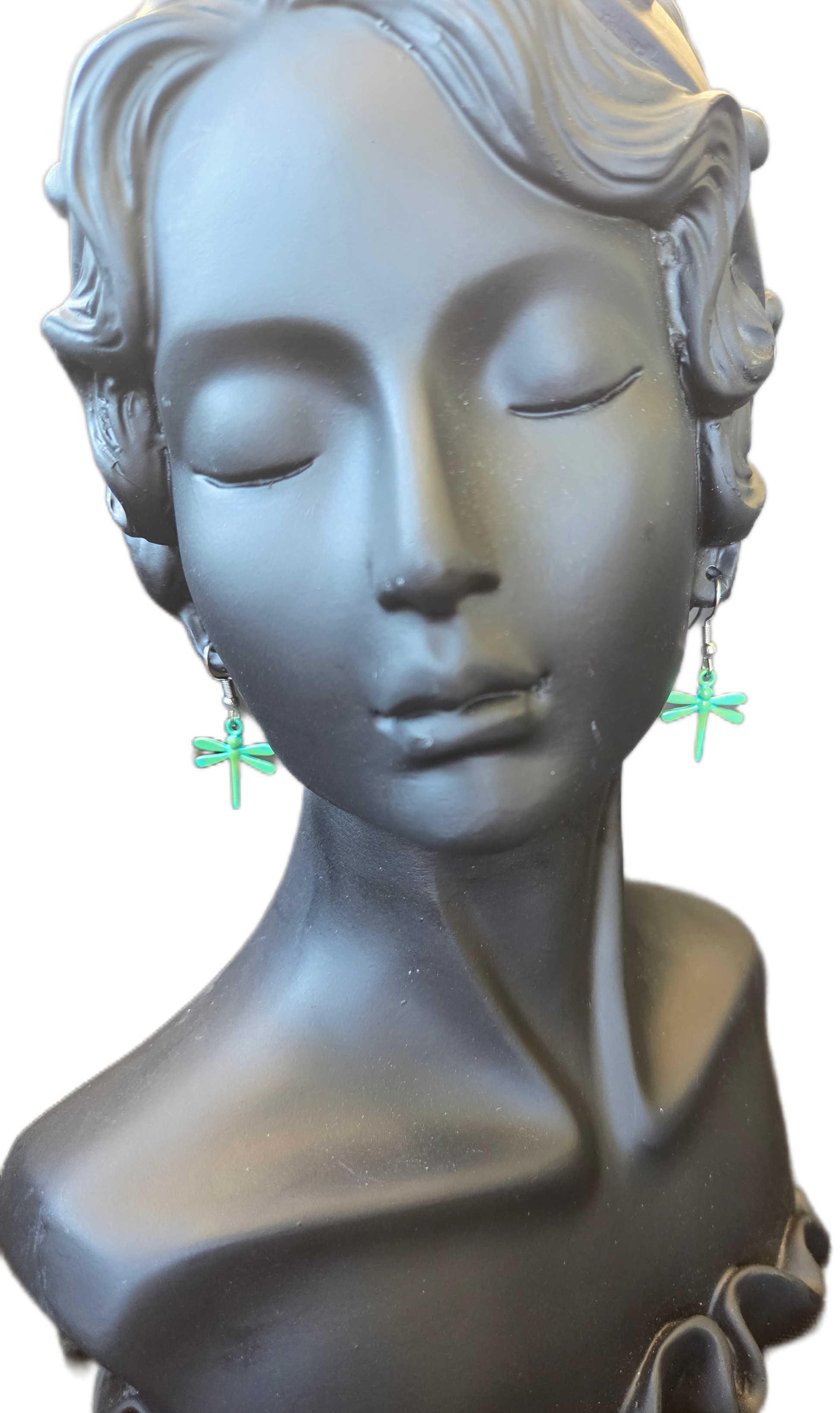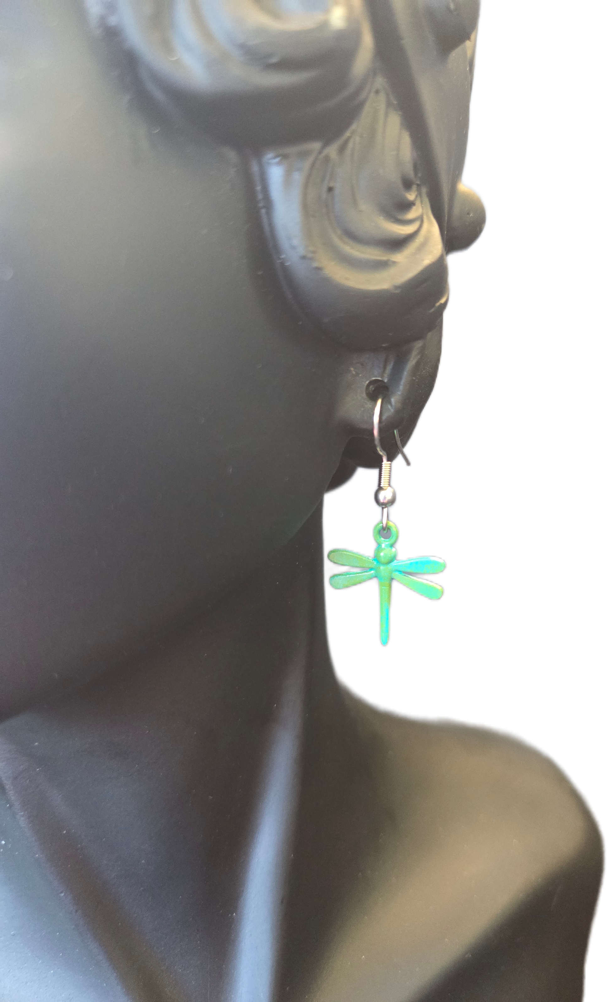 These beautiful earrings are handmade and done in a beautiful patina all by hand. They feature a small dragonfly. They dangle and are approximately 1 1/2" long. So pretty!