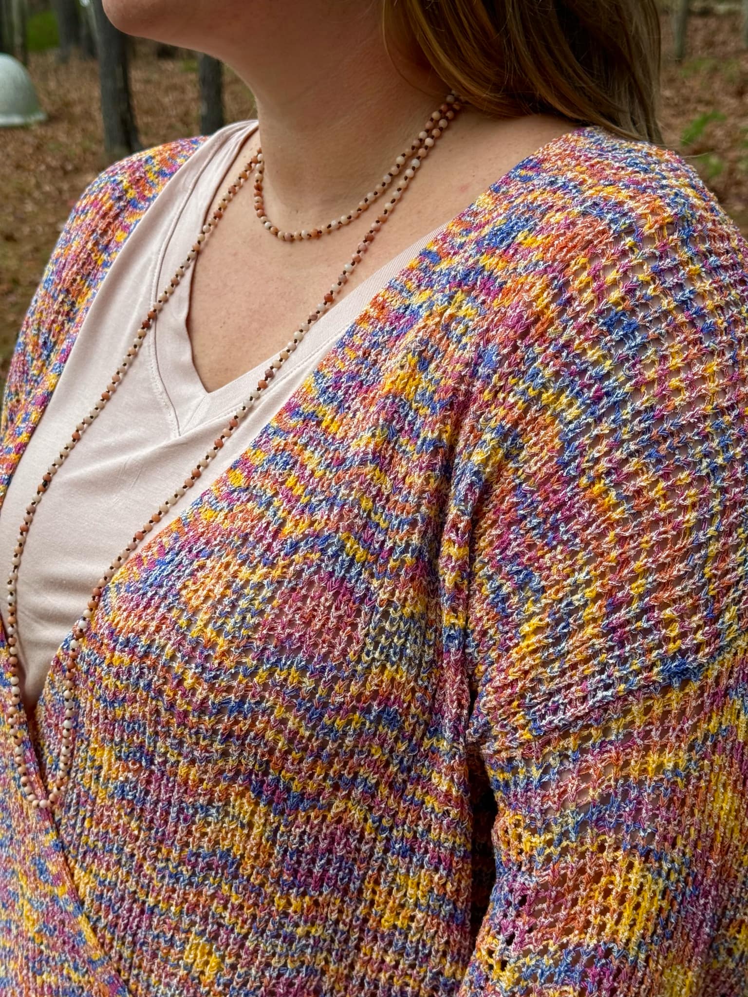 This lovely necklace is so simple and pretty. It has light colored beads in shades of pink, peach, and white. It's very long.