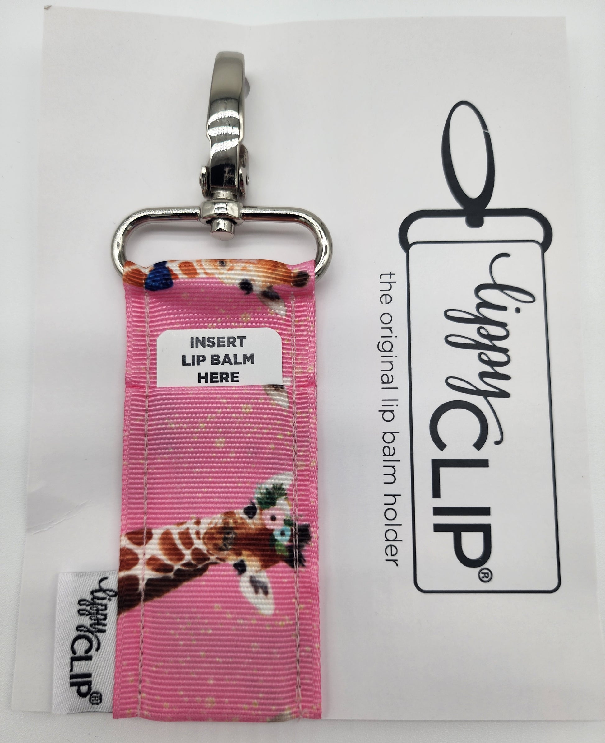 This LippyClip features a bright pink giraffe pattern with bowties and floral headbands.