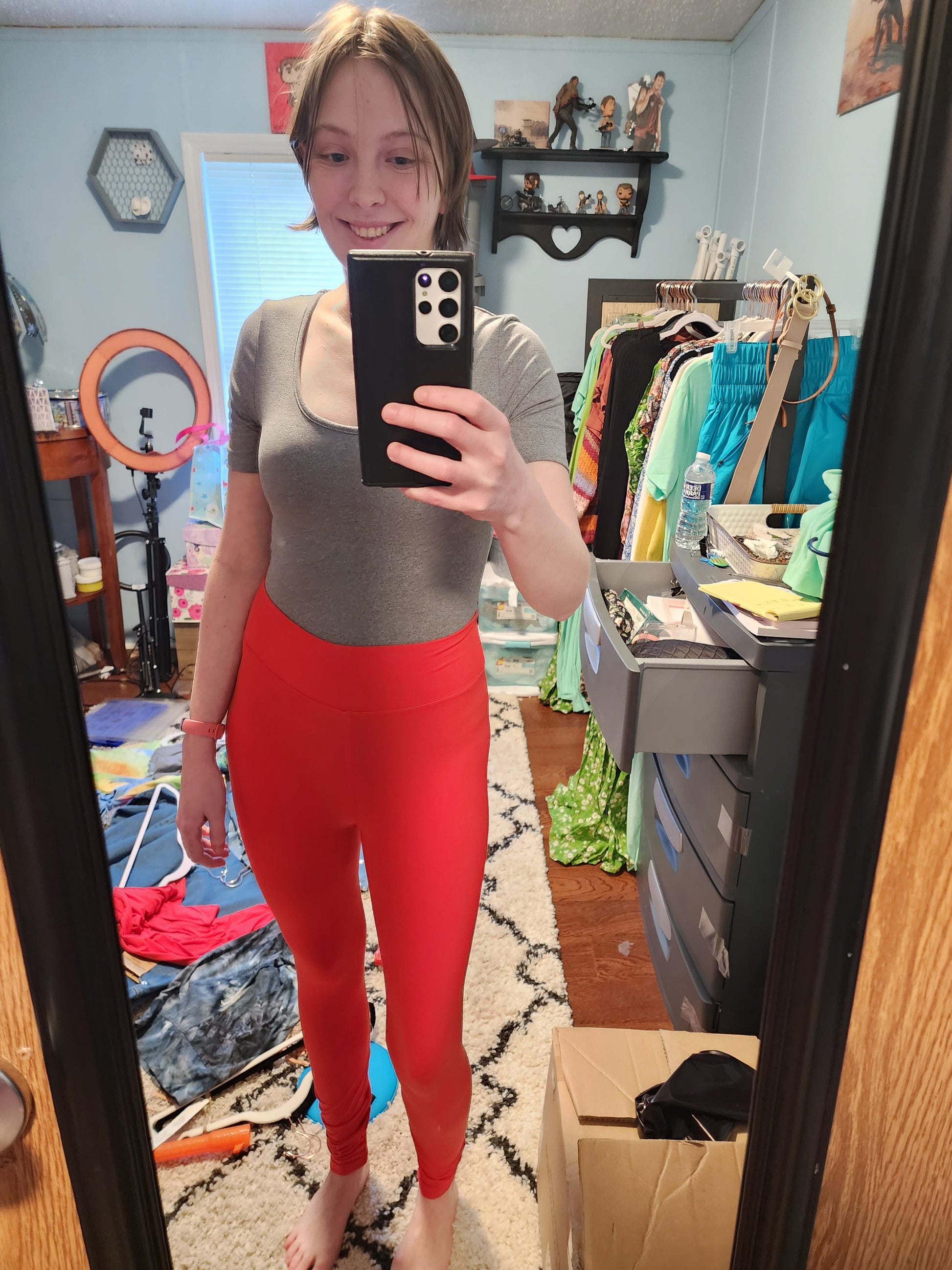 These bright red leggings are made of a nice spandex material. They're very comfy and would be great for layering!