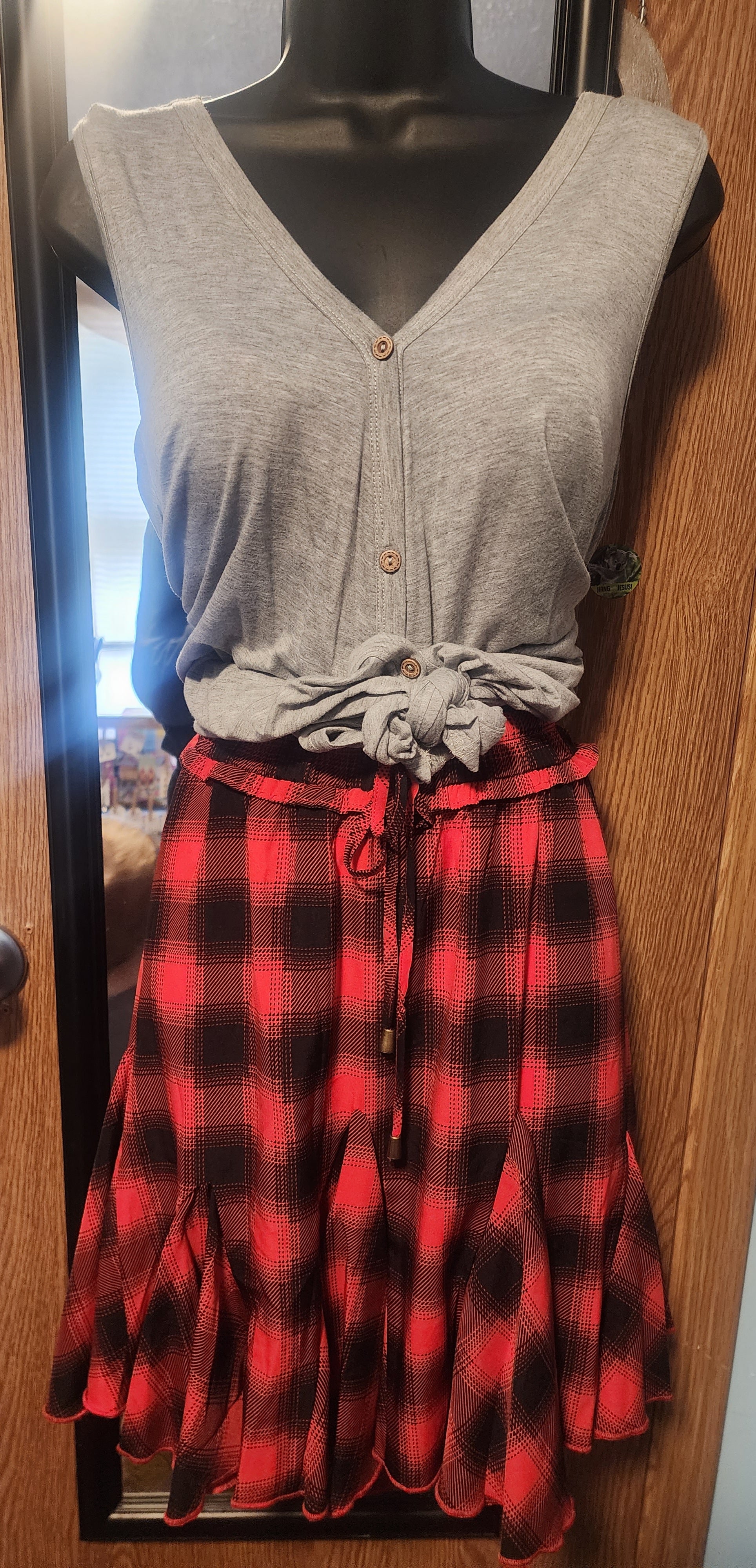 This skirt is so cute and bouncy. It's got a beautiful red and black plaid and is lined to keep you warm. It's about thigh to knee length. It has a tie to adjust the sizing.