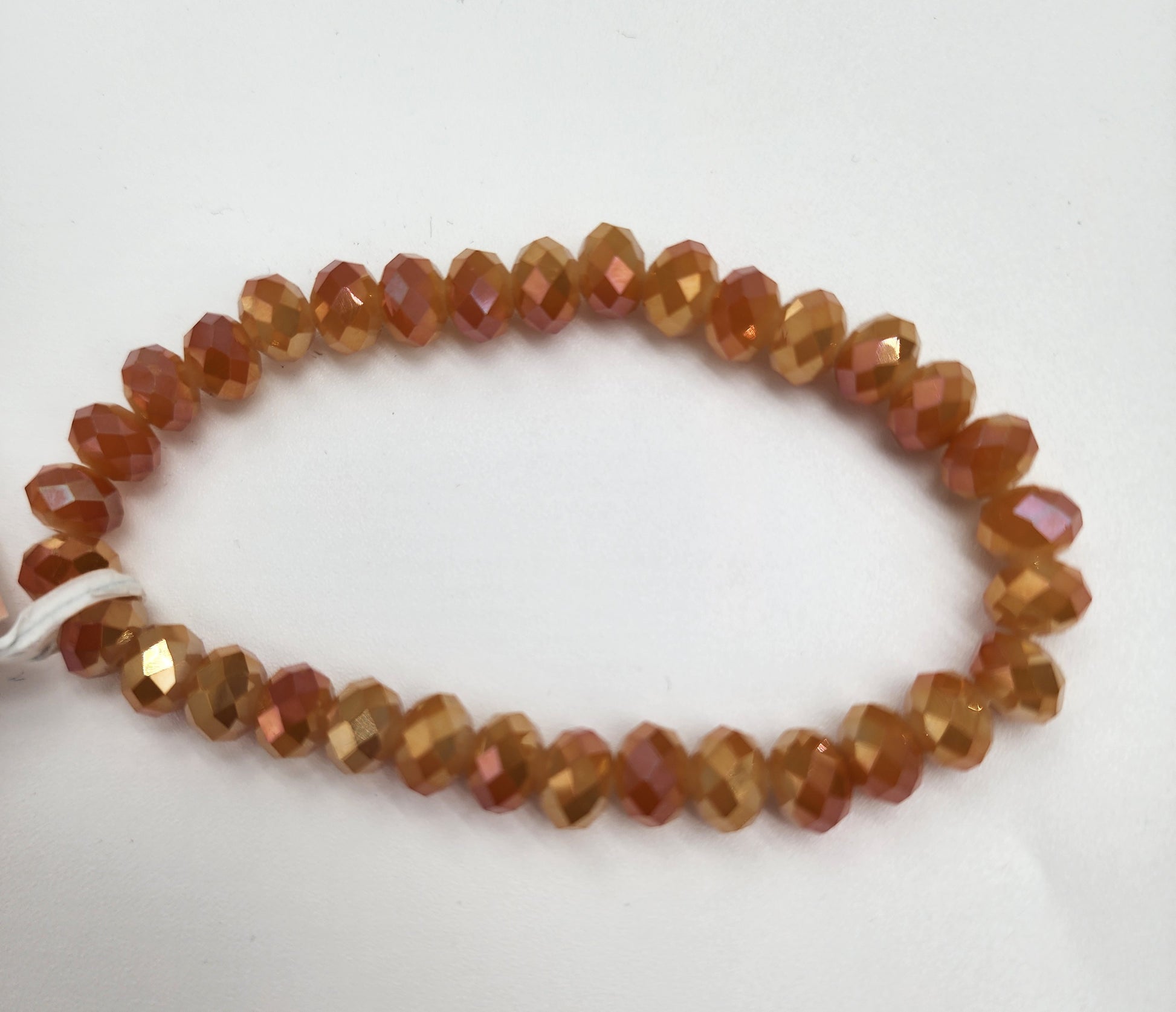 These beautiful bracelets are so very shiny. They have beads that shine. The orange is a beautiful copper color and the white is almost a cream. They are stretchy.