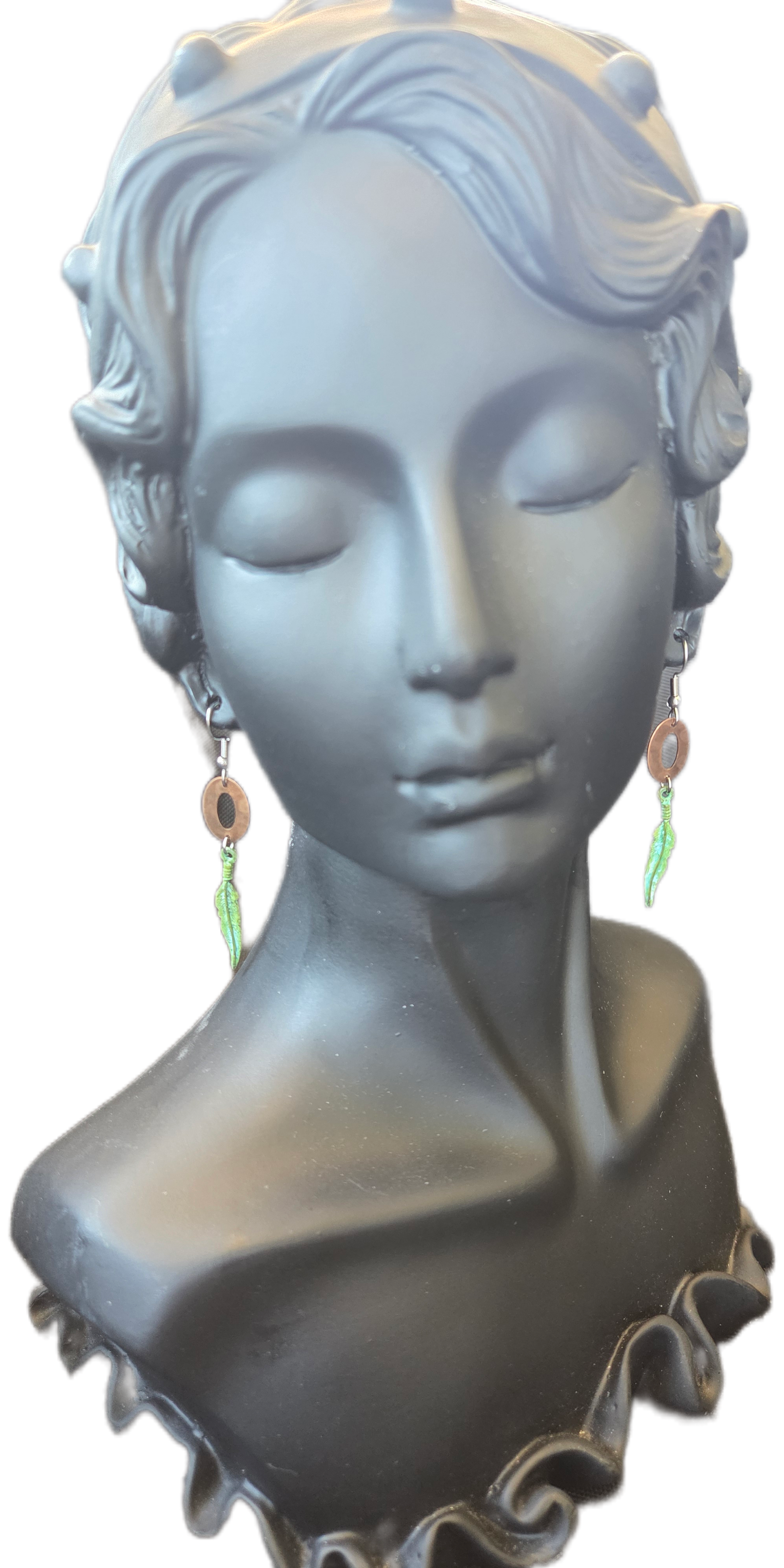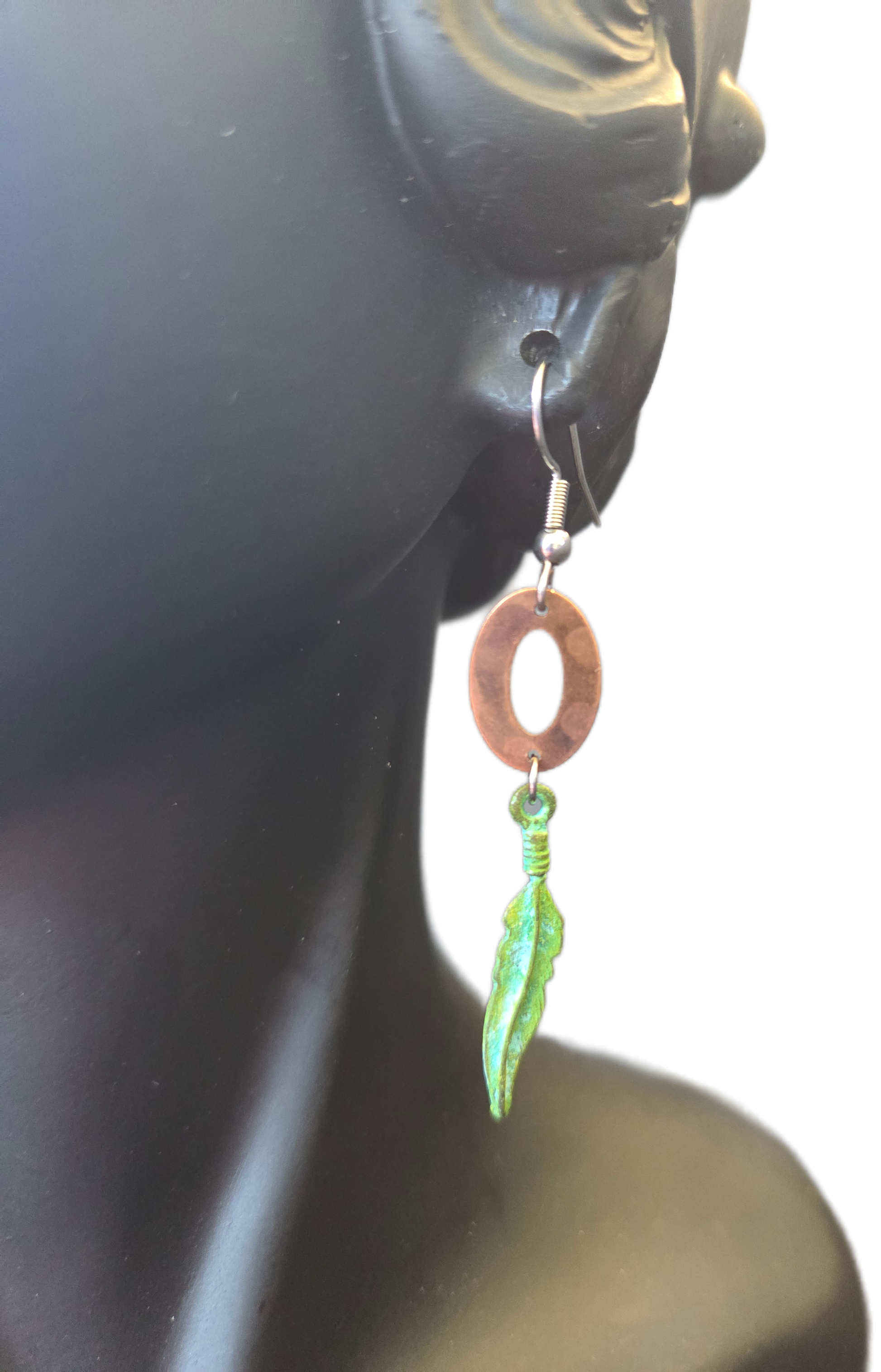 These beautiful earrings are handmade and done in a beautiful patina all by hand; they feature small brass ovals and small feathers at the bottom. They dangle and are approximately 2" long. So pretty and unique; especially for a boho loving person!