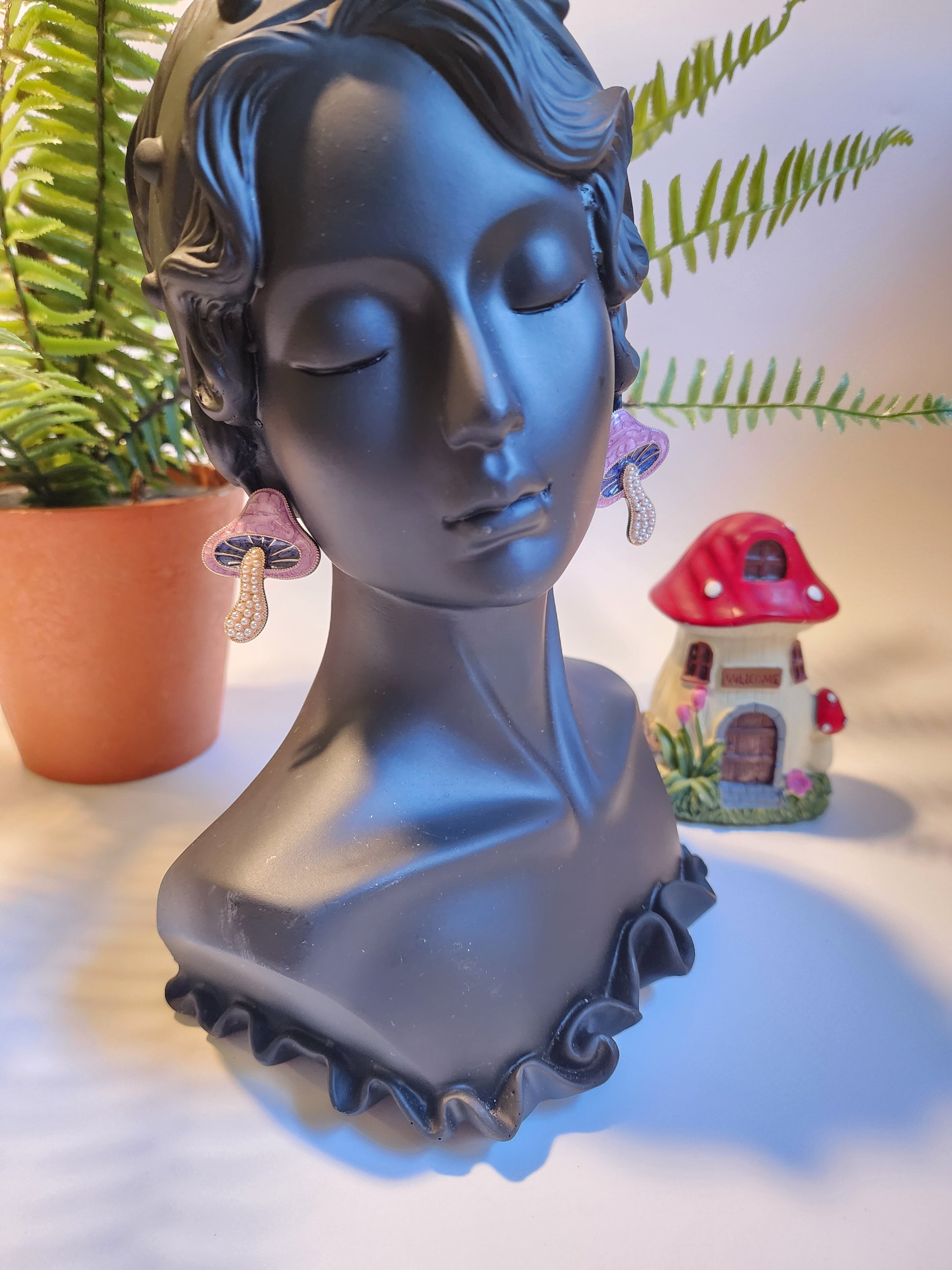 These earrings are so cute with a simple but bright solid color and some small faux pearls dotting the stem of the mushrooms. They have a neat marble affect at the top. They're studs and approximately 1 1/2" tall.