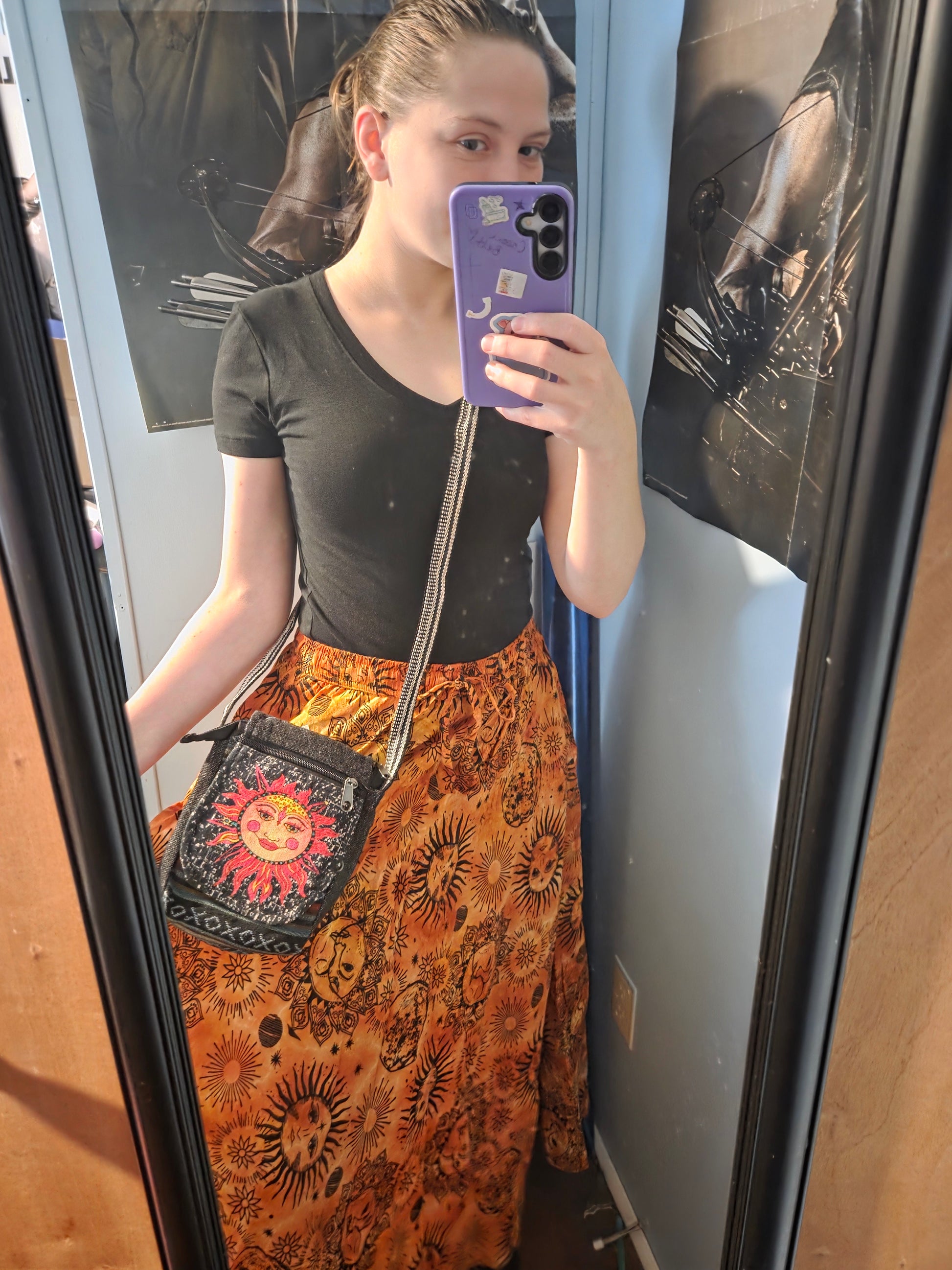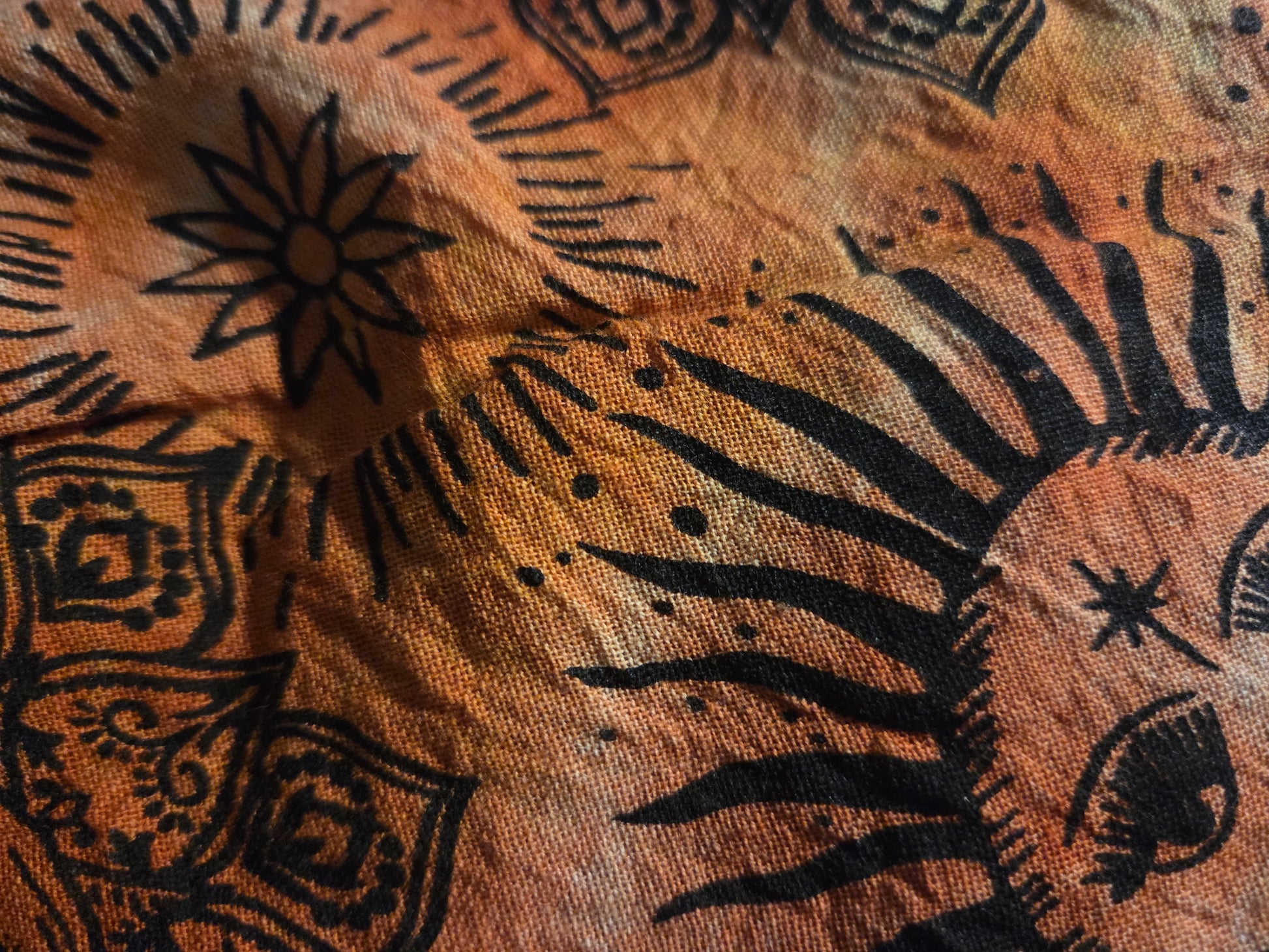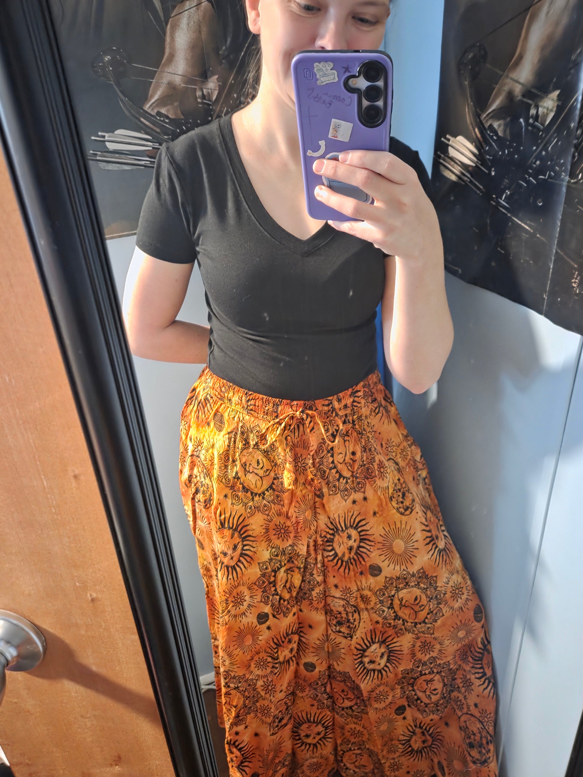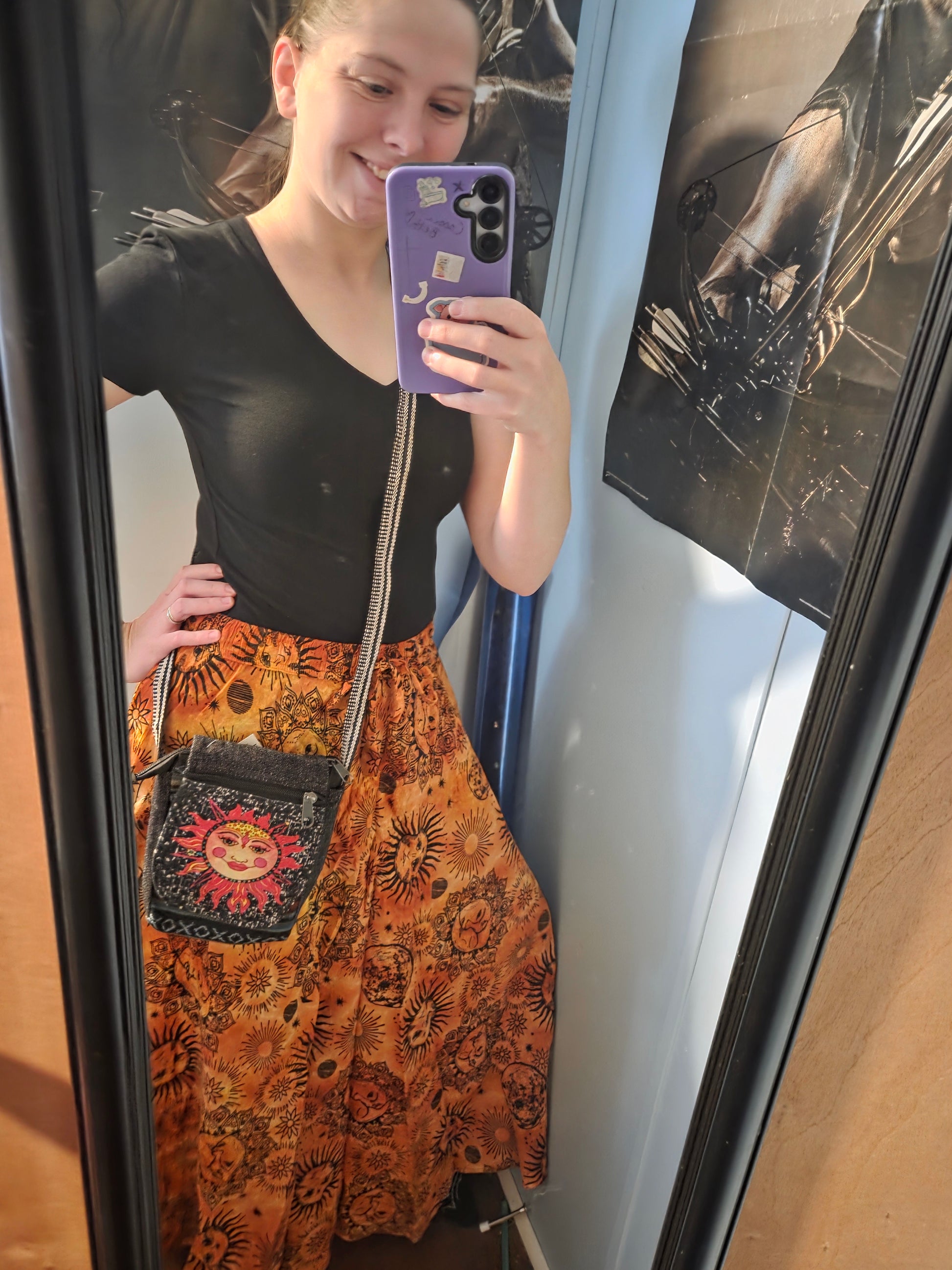 This skirt is so cute with its orange tye dye background and sunshine pattern all over. It is definitely one of a kind and has an elastic waist band. Who doesn't love the sun? 🌞 This is one size which typically fits small-large and sometimes an XL.