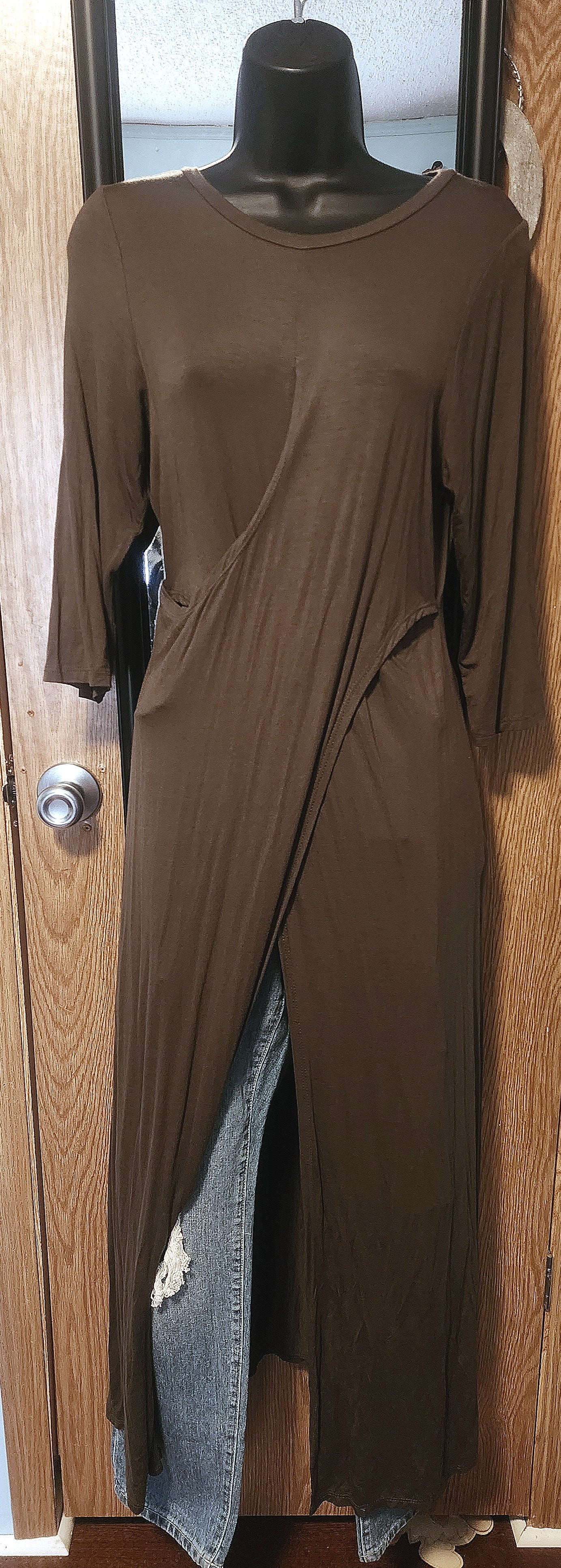 This top is so very unique. It's long enough to be a dress (around mid calf length). It's so fun to put with jeans. It definitely makes a statement! It's a beautiful dark olive color.