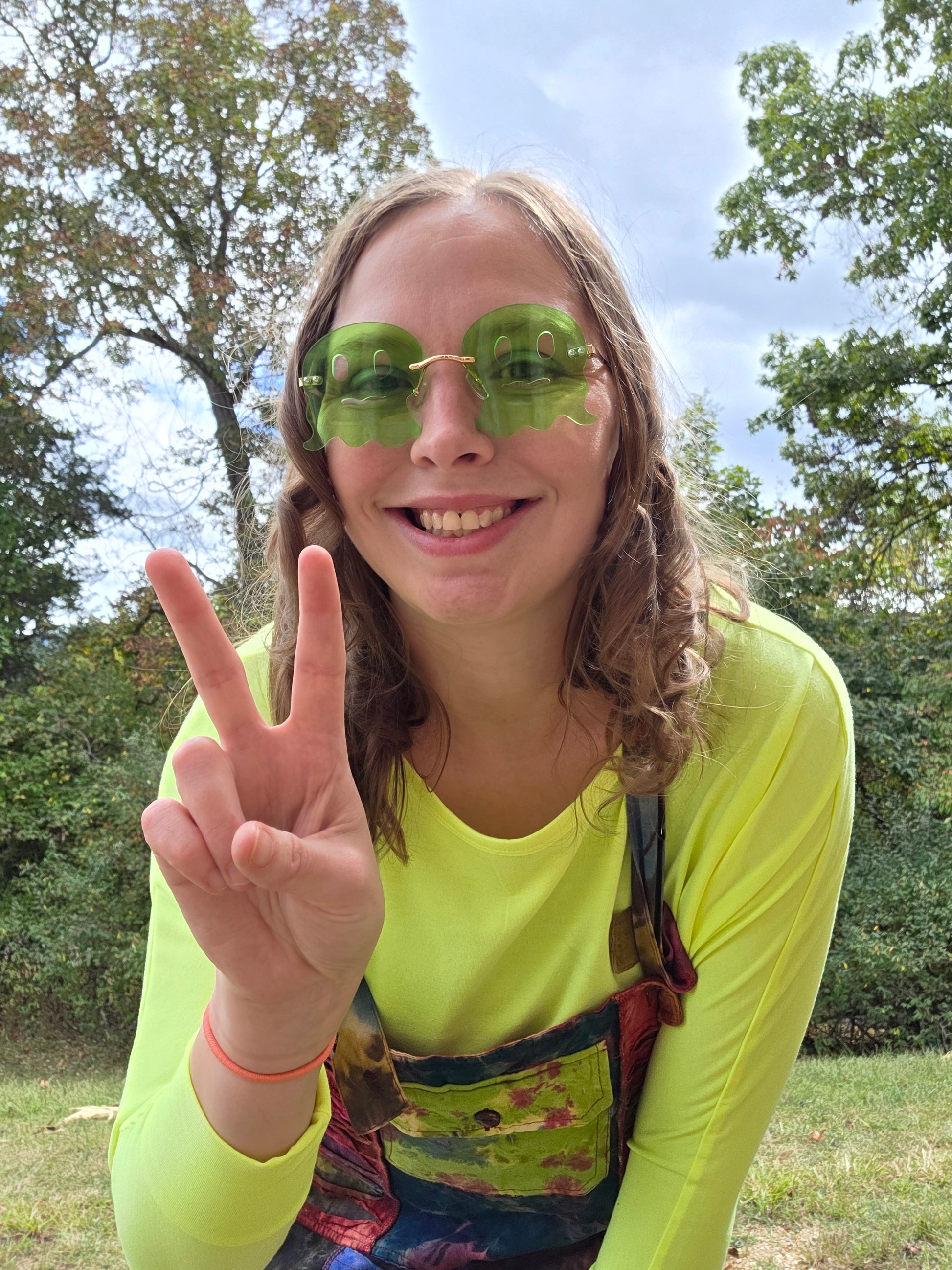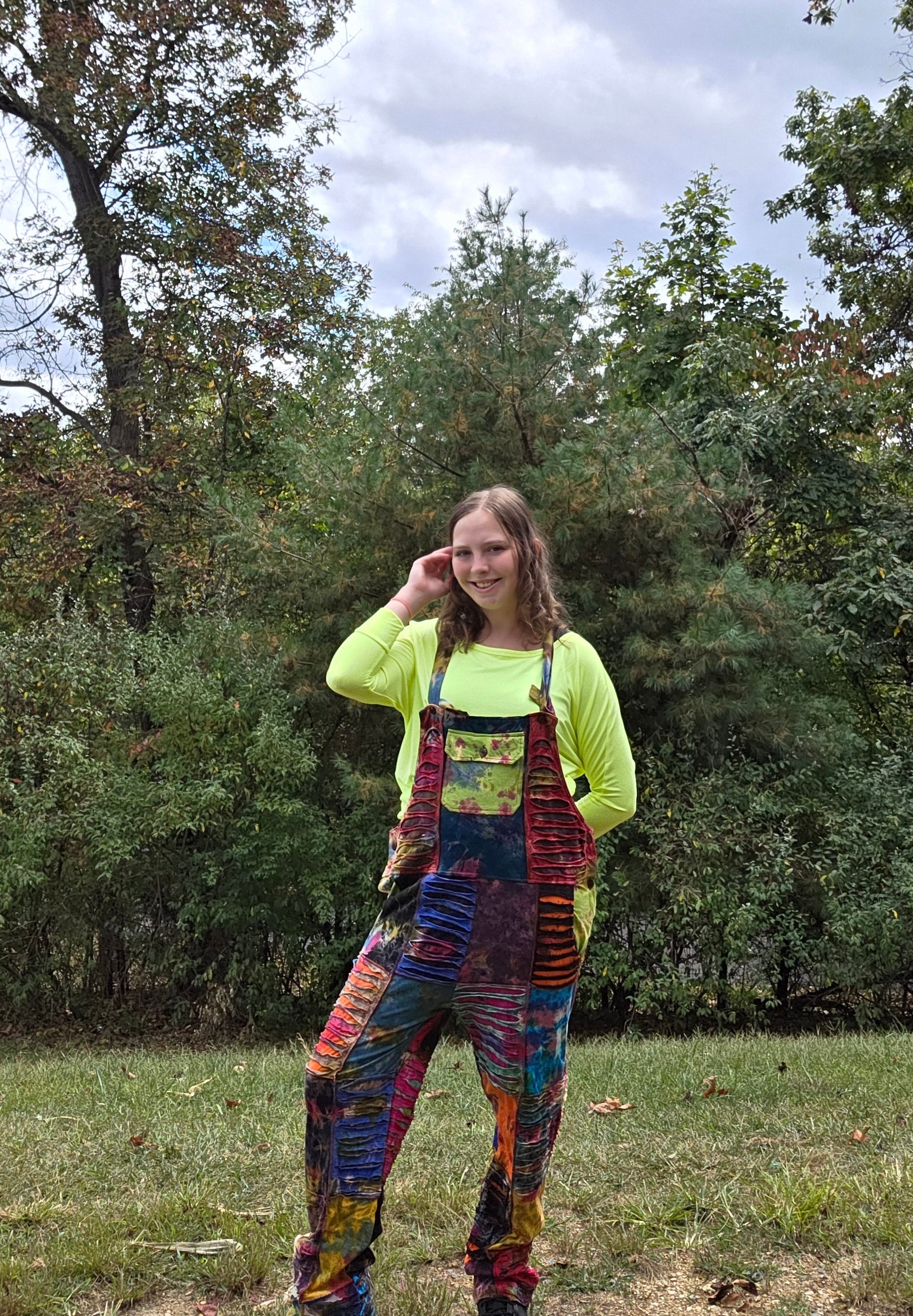 These overalls are so fun with bright colored tie-dye and a razer cut pattern. They have buttons and are adjustable. They're one size fits all and will be oversized on a small-medium. They're hand dyed.