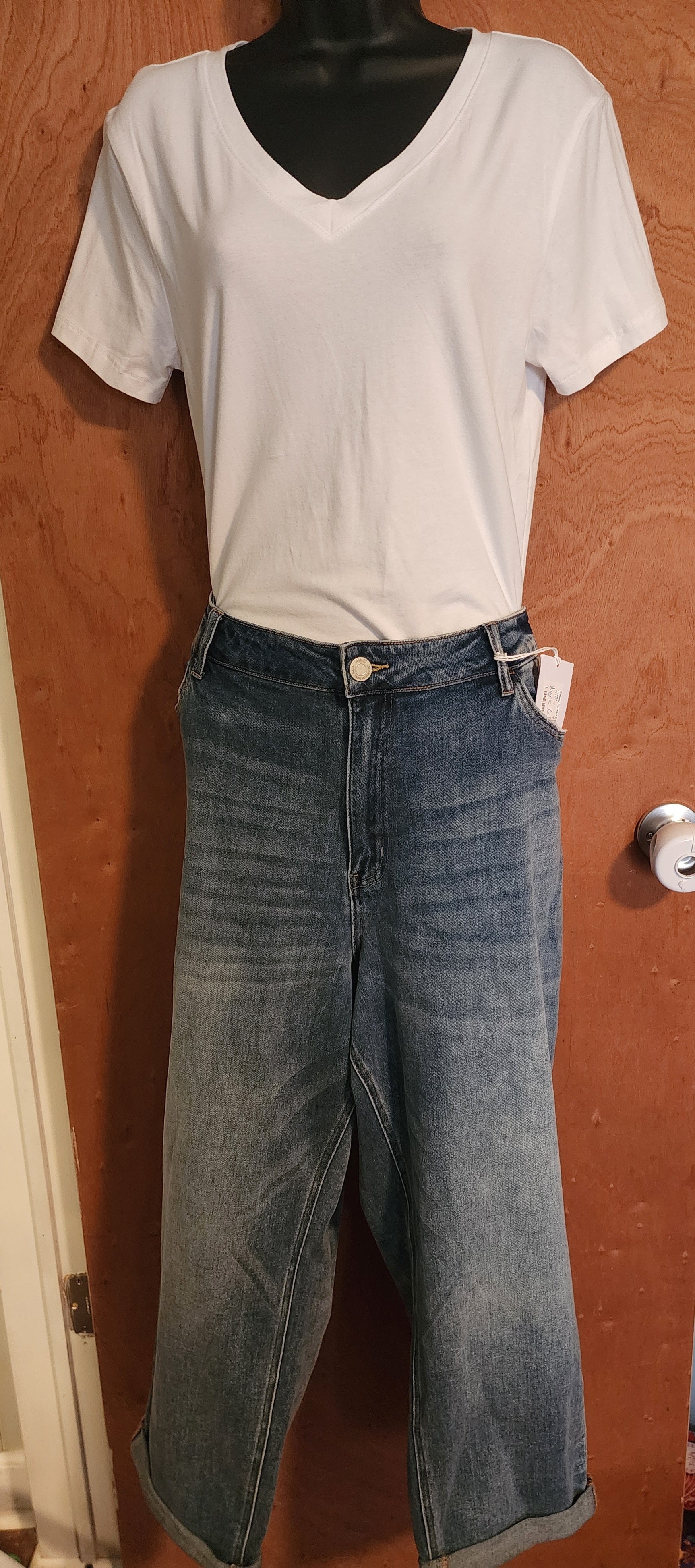 These jeans are boyfriend cut and roll up at the bottom. They button and zip and are well made.