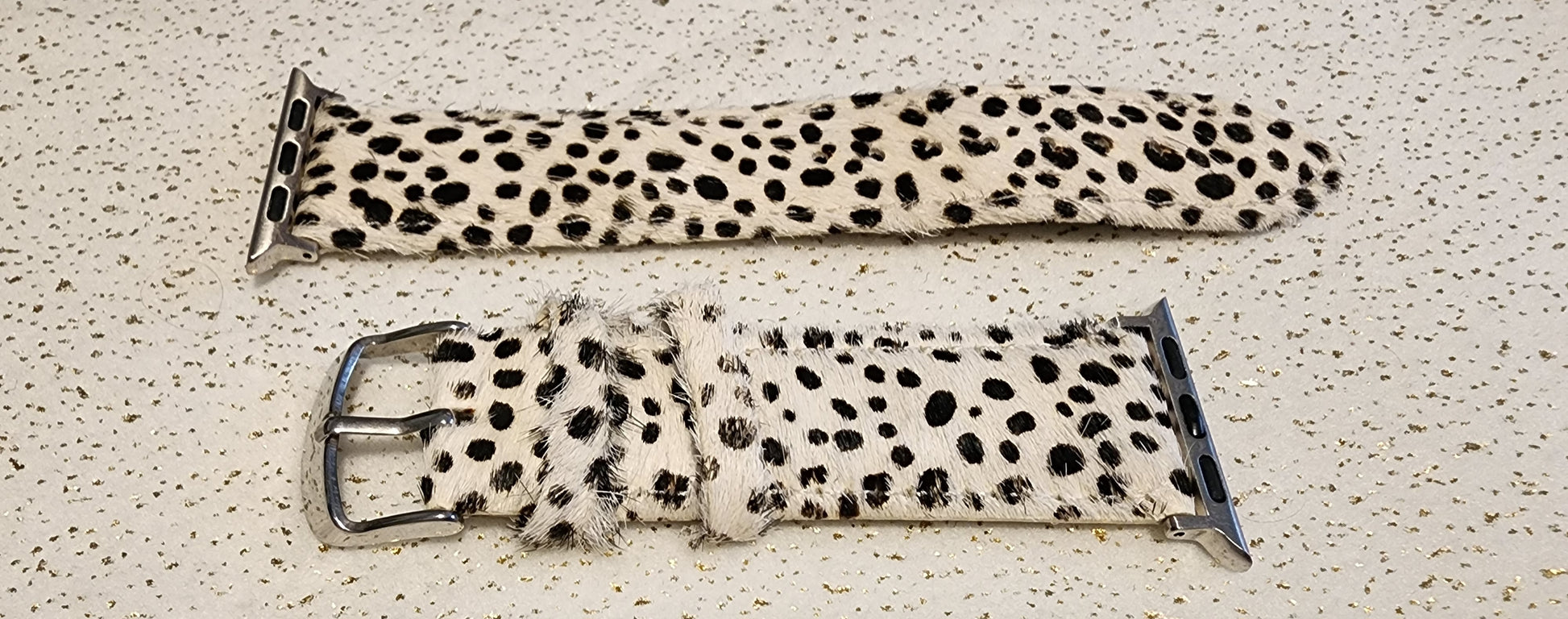 These watch bands make a statement and they're so unique. They're for Apple watches. They're a 38/40 mm which is size M/L. They can be traded out if you buy more than one. The dalmatian one is furry to the touch.