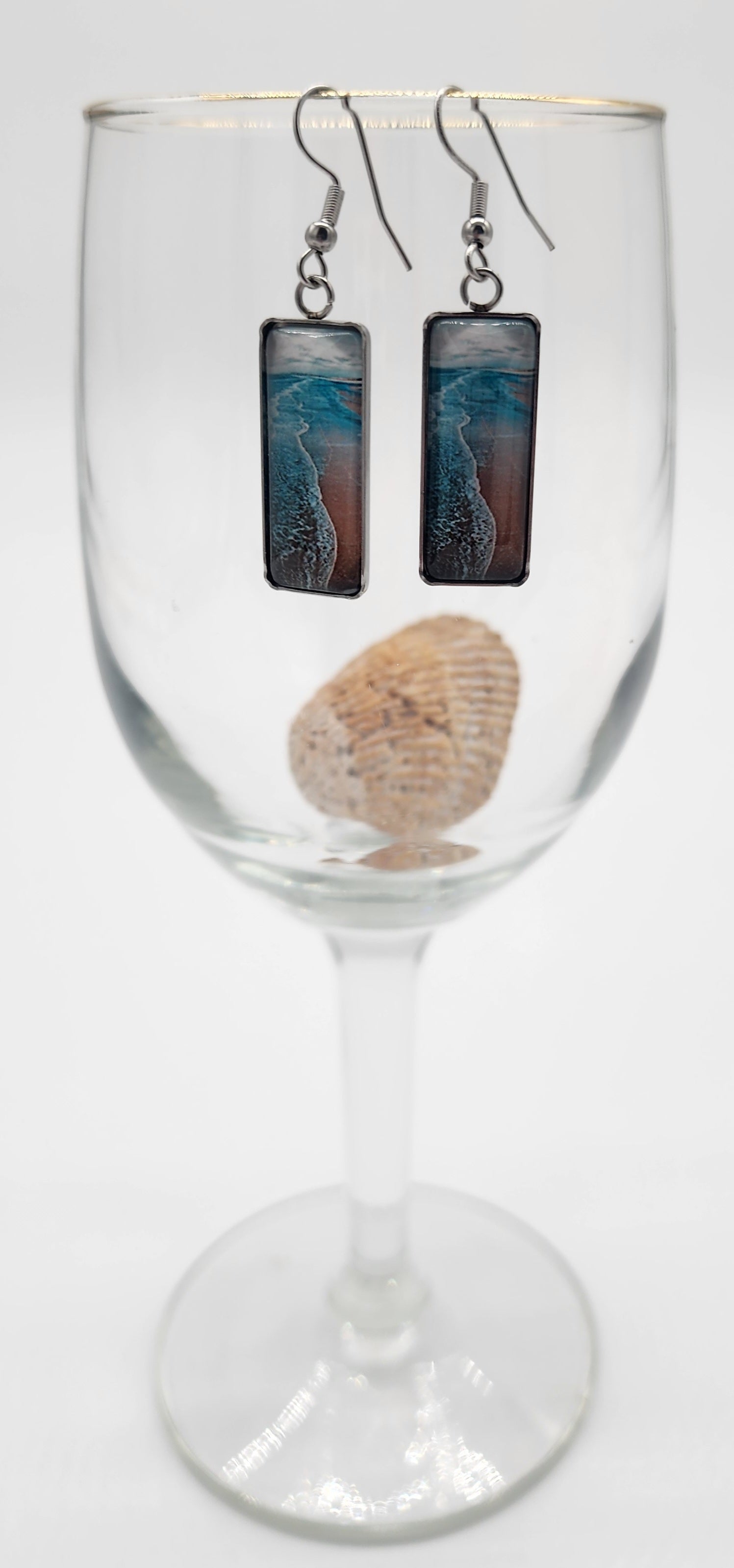 These earrings have a wonderful scene of the line where the ocean and sand meet. They're very well made, dangle, and are approximately 1 1/2" long.
